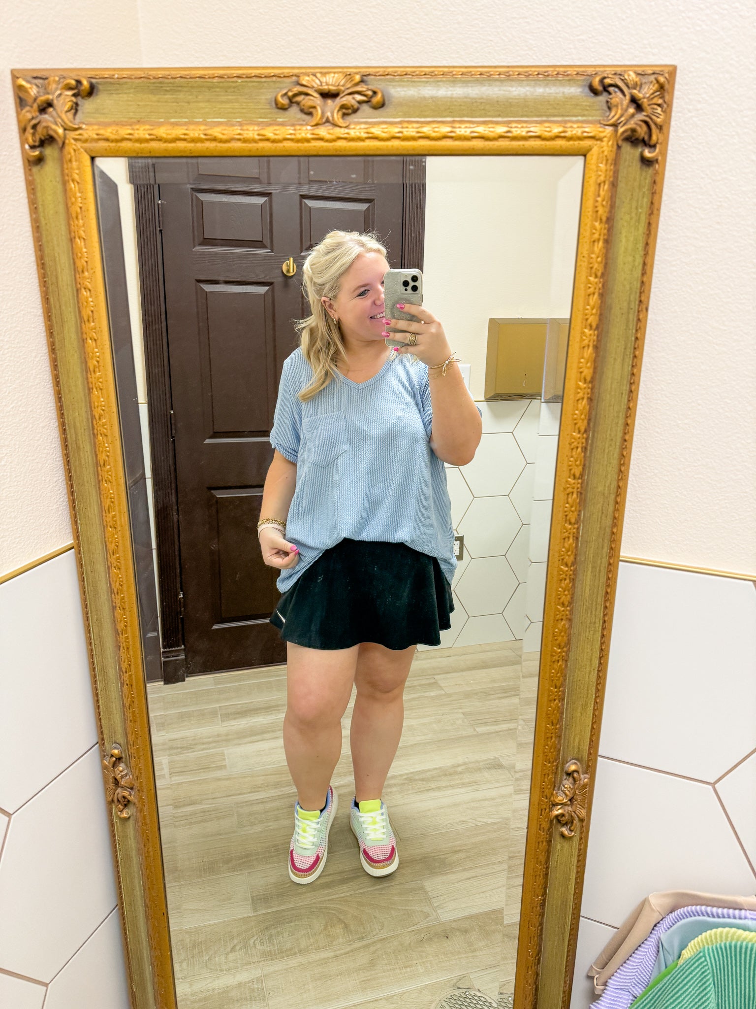 V-neck short sleeve top featuring rolled sleeve hem and pocket at bust. Unlined. Knit. Non-sheer. Lightweight.