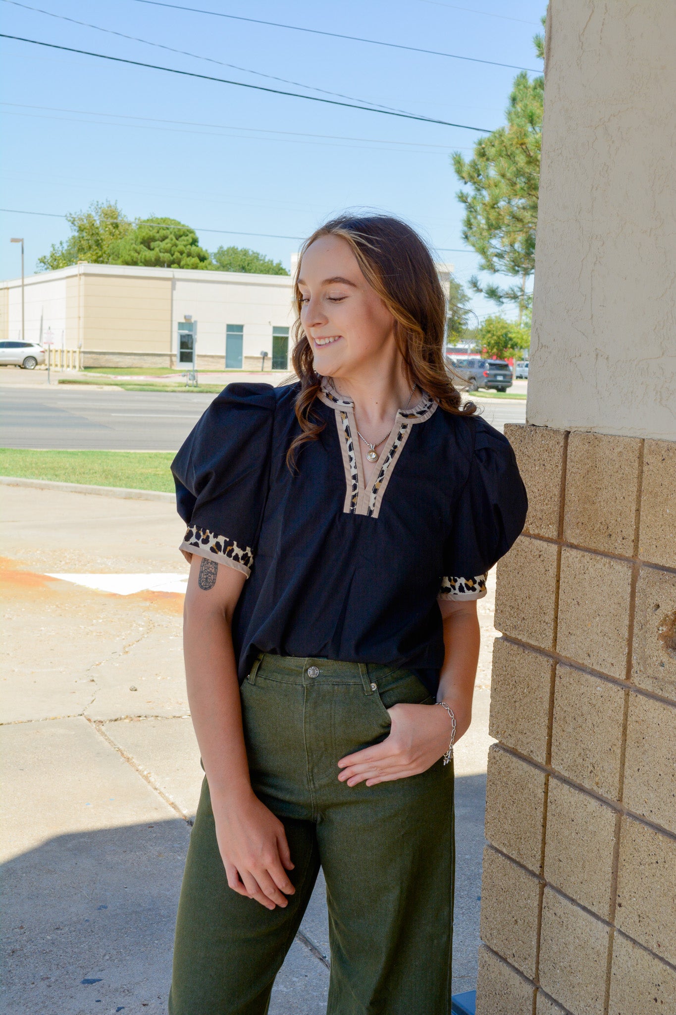 Add a pop of fierce femininity to your fall wardrobe with this lightweight pleated pullover top. Featuring voluminous short sleeves and a bold leopard print split V-neck and band, this semi-sheer woven blouse is perfect for layering or making a statement on its own. Chic, breathable, and effortless—this is the piece your closet didn’t know it needed.
