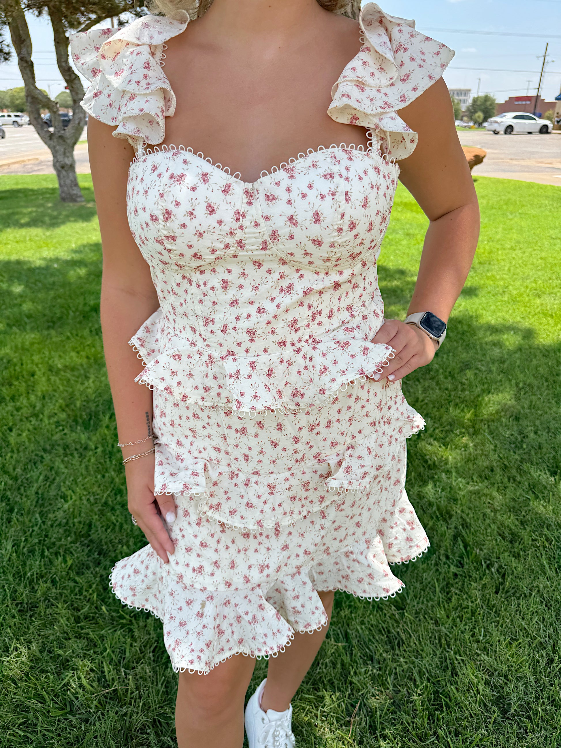 Looking for the perfect sorority rush outfit? This floral printed mini dress is made for standout first impressions. Featuring delicate ruffle details, a flattering tiered silhouette, and a structured corset bodice with adjustable straps, it’s equal parts feminine and fierce. The back lace-up detail and invisible zipper ensure a custom, curve-hugging fit, while the soft lining keeps you comfortable all day.