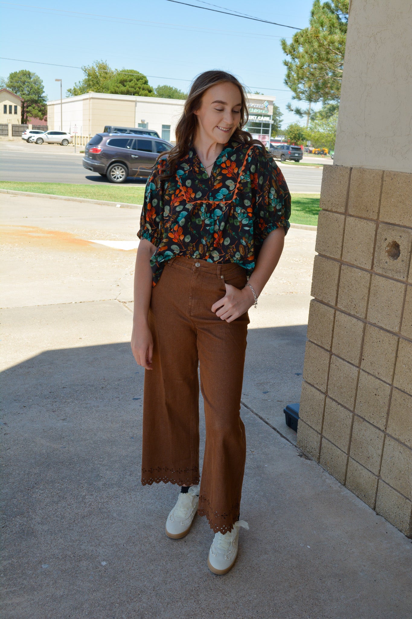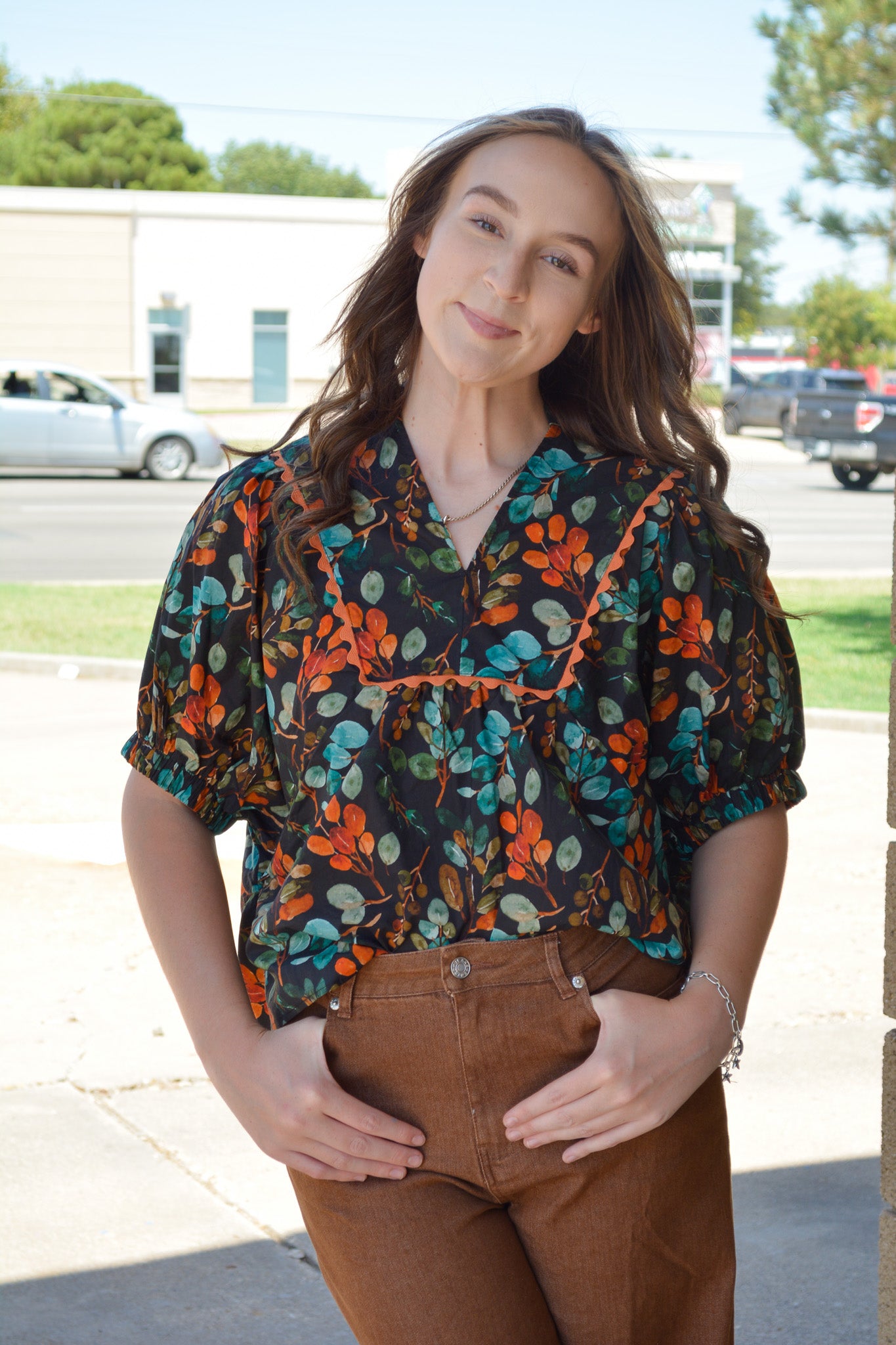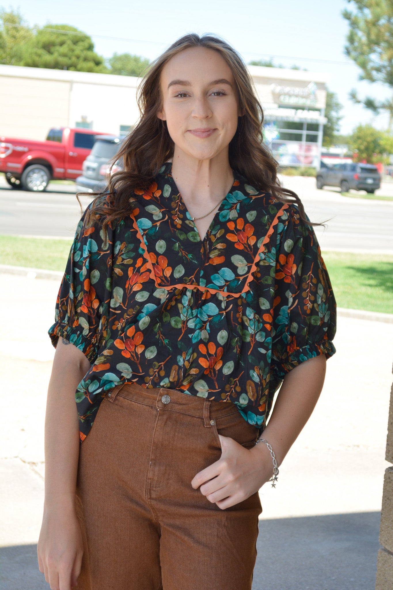 fall floral blouse, botanical print top, dolman sleeve blouse for women, fall fashion essentials, scallop trim top, lightweight fall tops, boutique blouses for fall