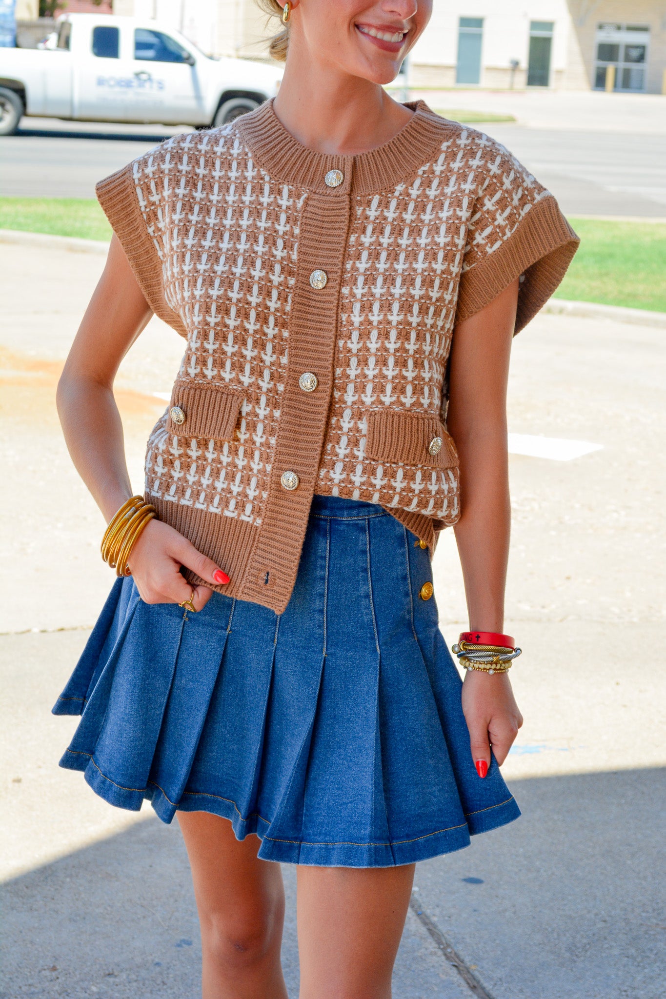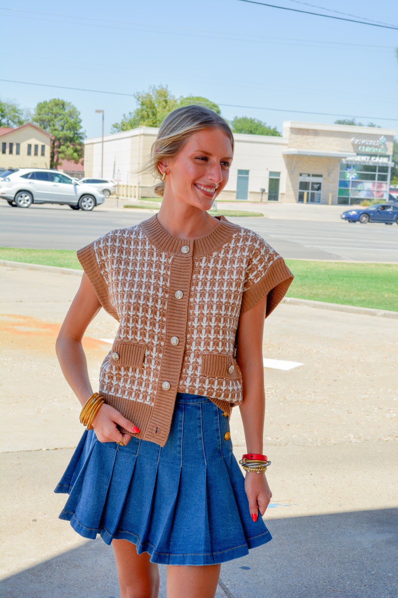 Classic with a twist π€ This cropped houndstooth sweater blends timeless print with trendy flair. Featuring a front button closure and ultra-soft knit, this taupe and white beauty is perfect for layering through chilly days and cozy nights. Dress it up with trousers or down with high-rise denim β either way, it's a must-have for your fall wardrobe.