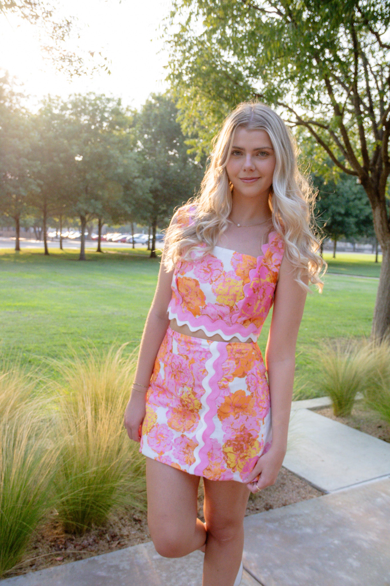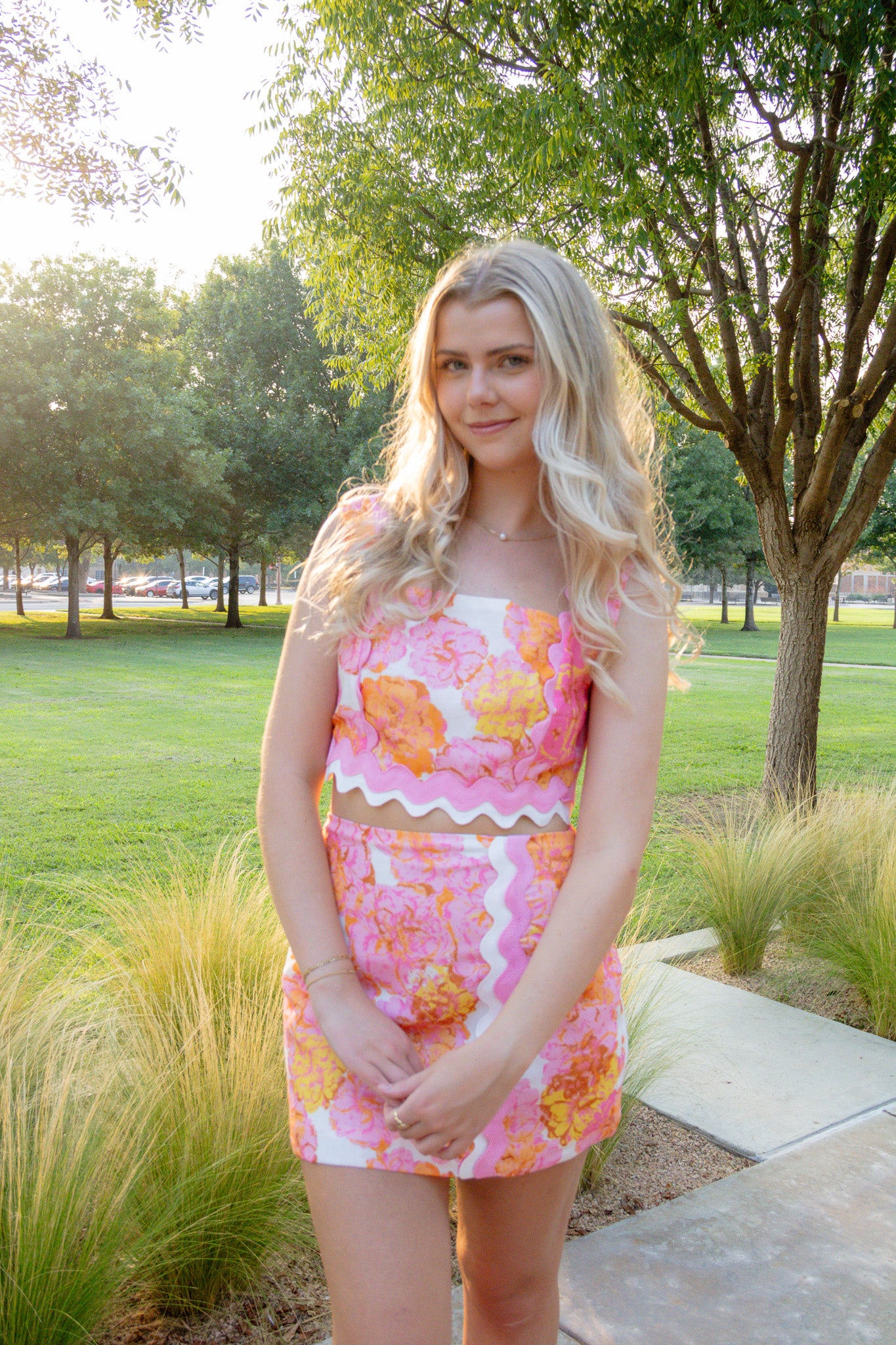 This stunning crop top is perfect for any spring or summer occasion, particularly garden parties, tea parties, or derbies. It boasts an eye-catching and feminine floral print and features a stylish square neckline that draws attention to your collarbone and shoulders. The sleeveless design is perfect for warmer weather, while the back zipper ensures a comfortable and secure fit. The top is accented with a unique color block riff raff wave trim that adds a touch of retro vintage flair to the overall look.