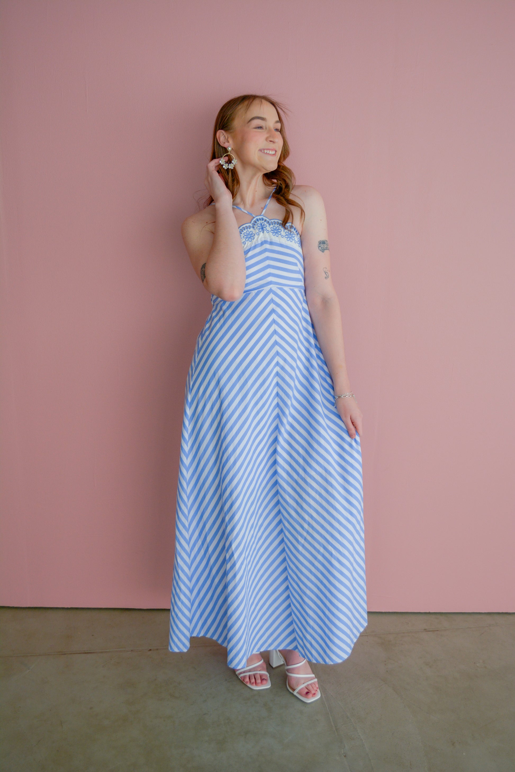 Perfect for shoppers searching for striped maxi dresses, resortwear dresses for women, vacation maxi dresses, coastal chic outfits, and halter neck summer dresses.