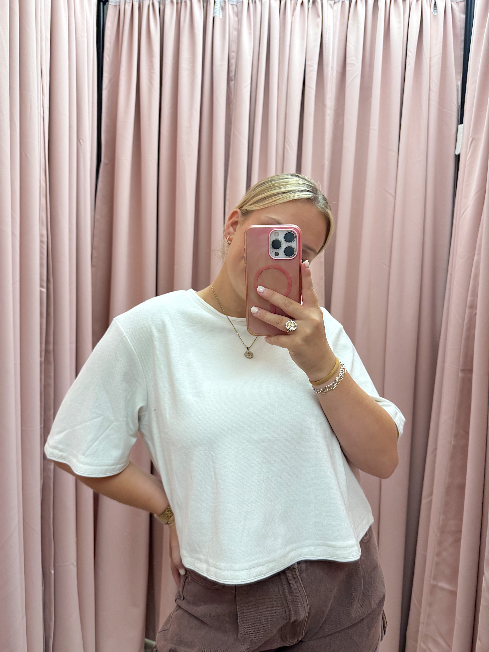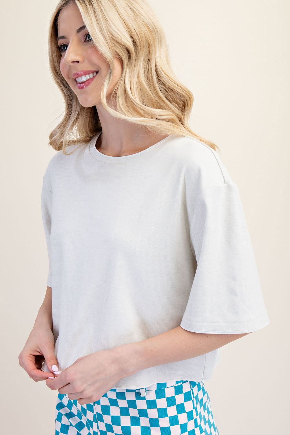 Effortless and on-trend ✨ This cropped knit tee features a relaxed boxy fit, round neckline, and dropped shoulders for that perfectly slouchy silhouette. Lightweight yet cozy, it’s the kind of piece you’ll reach for on repeat — whether you’re layering it over a tank or pairing it with high-rise bottoms.