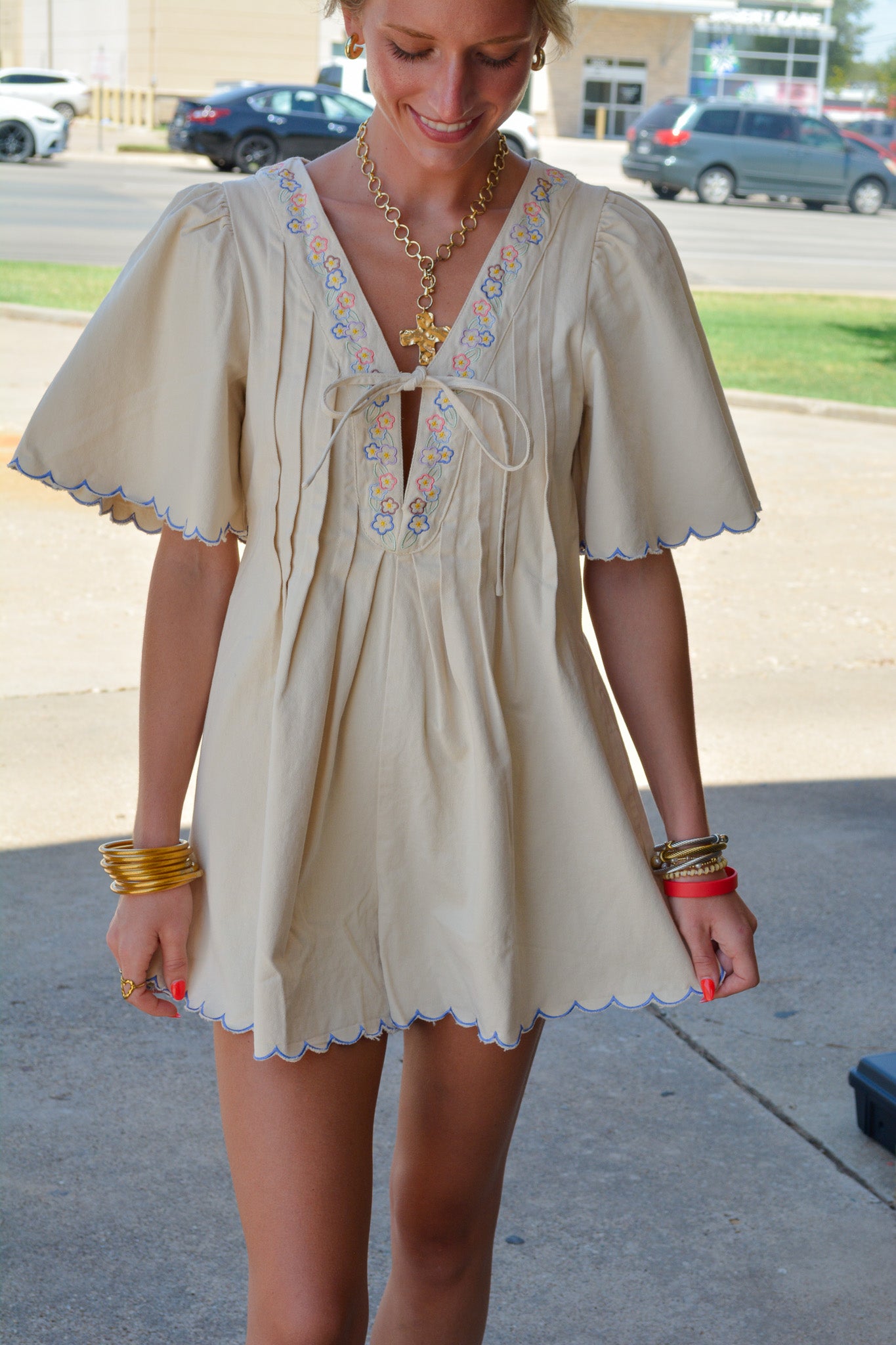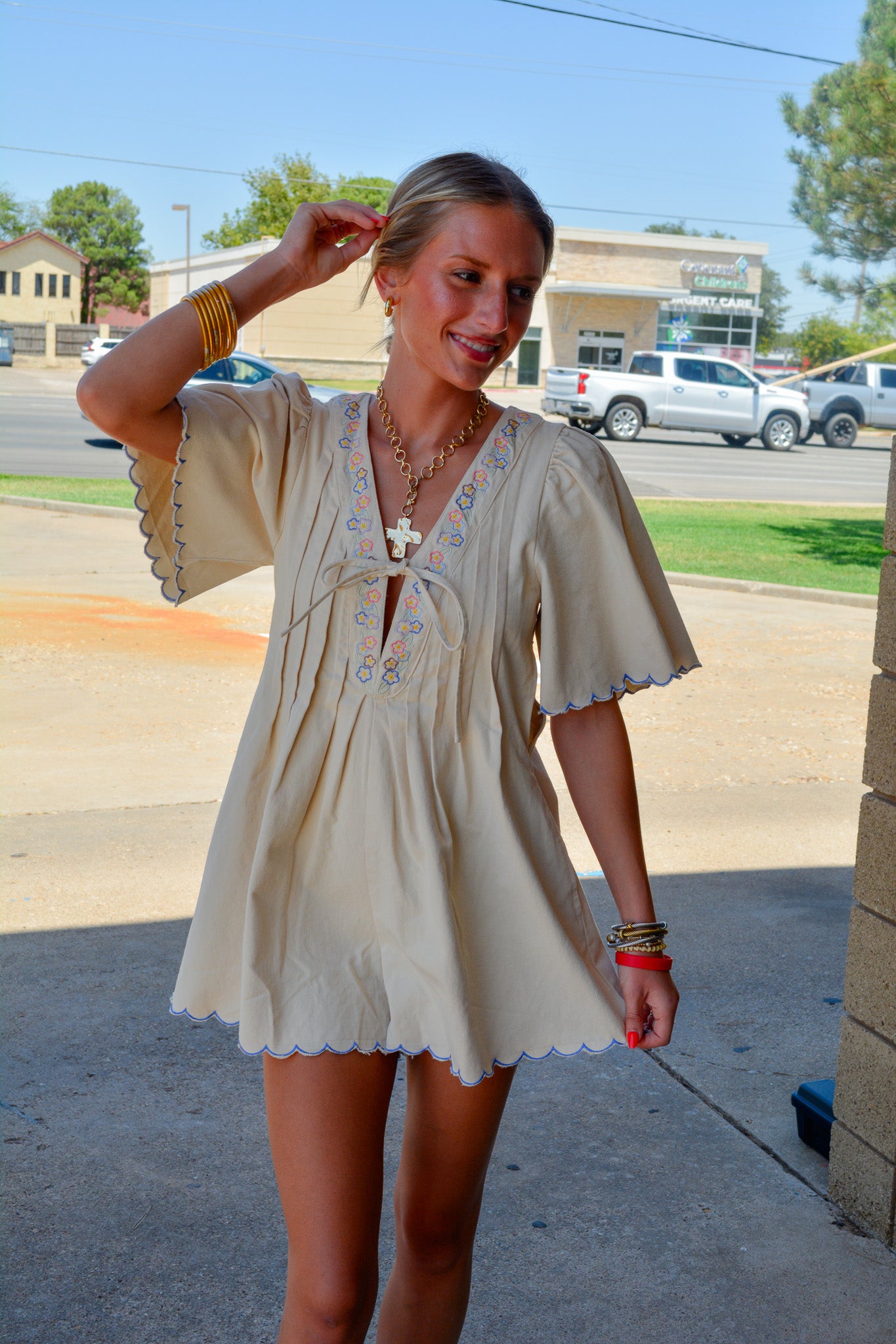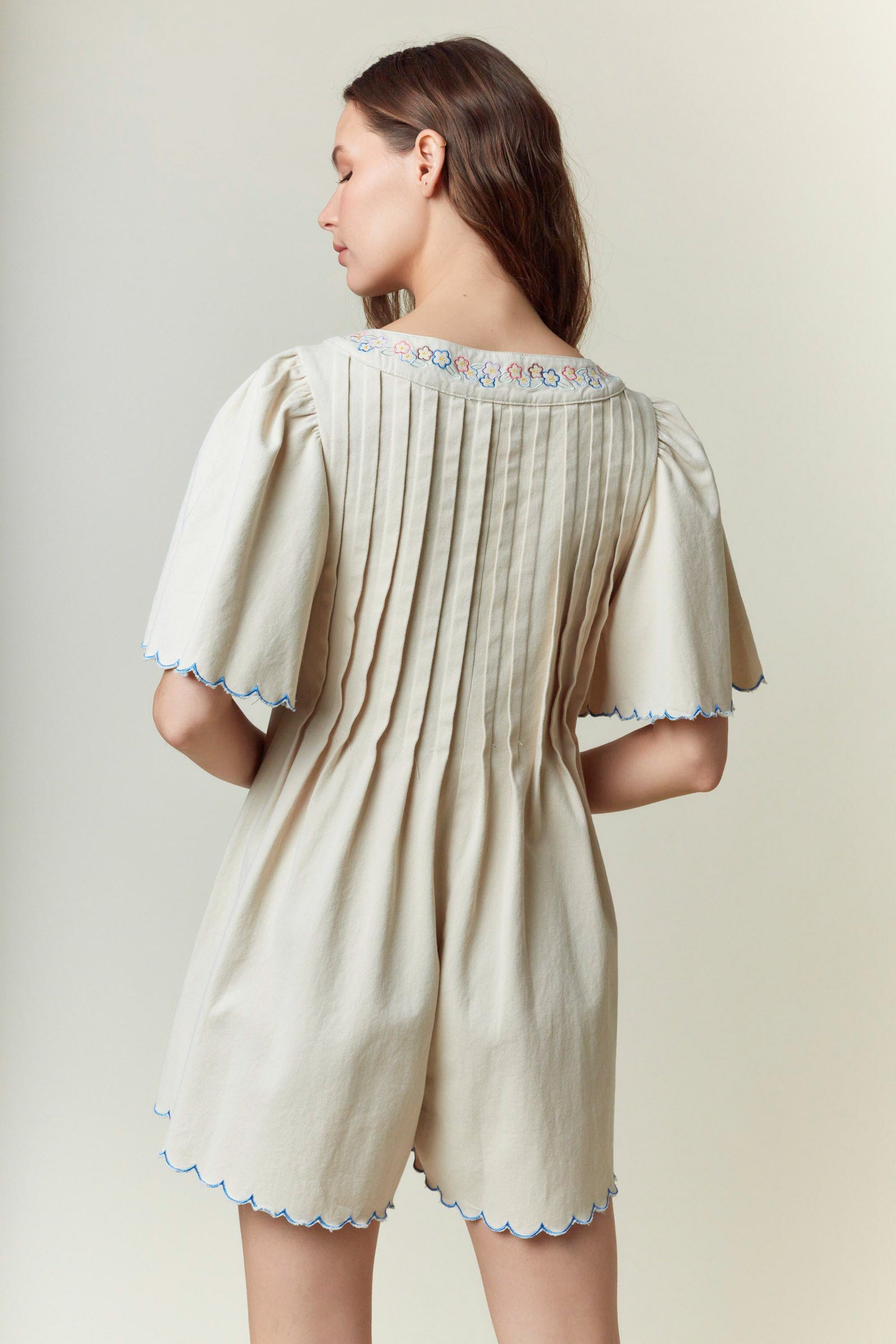 Bring delicate charm to your fall wardrobe with this floral romper featuring scallop embroidery and a flattering front tie detail. Soft and feminine, it’s perfect for layering under jackets or wearing solo on warmer days. The intricate embroidery adds a chic, handcrafted feel to this trendy, easy-to-wear piece.
