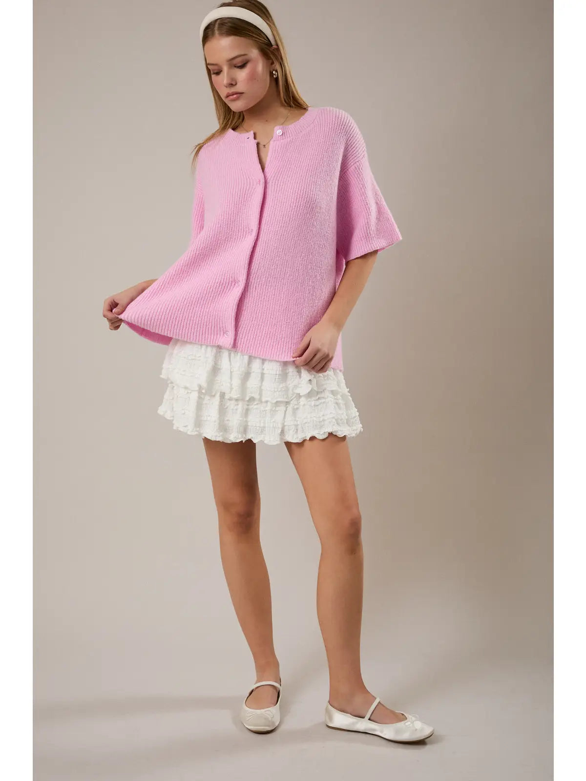 Soft, lightweight, and effortlessly chic, our Round Neck Short Sleeve Sweater Cardigan is the perfect layering essential for transitional seasons. Designed with a classic round neckline and short sleeves, this cardigan offers a refined silhouette that feels both polished and easy to wear.