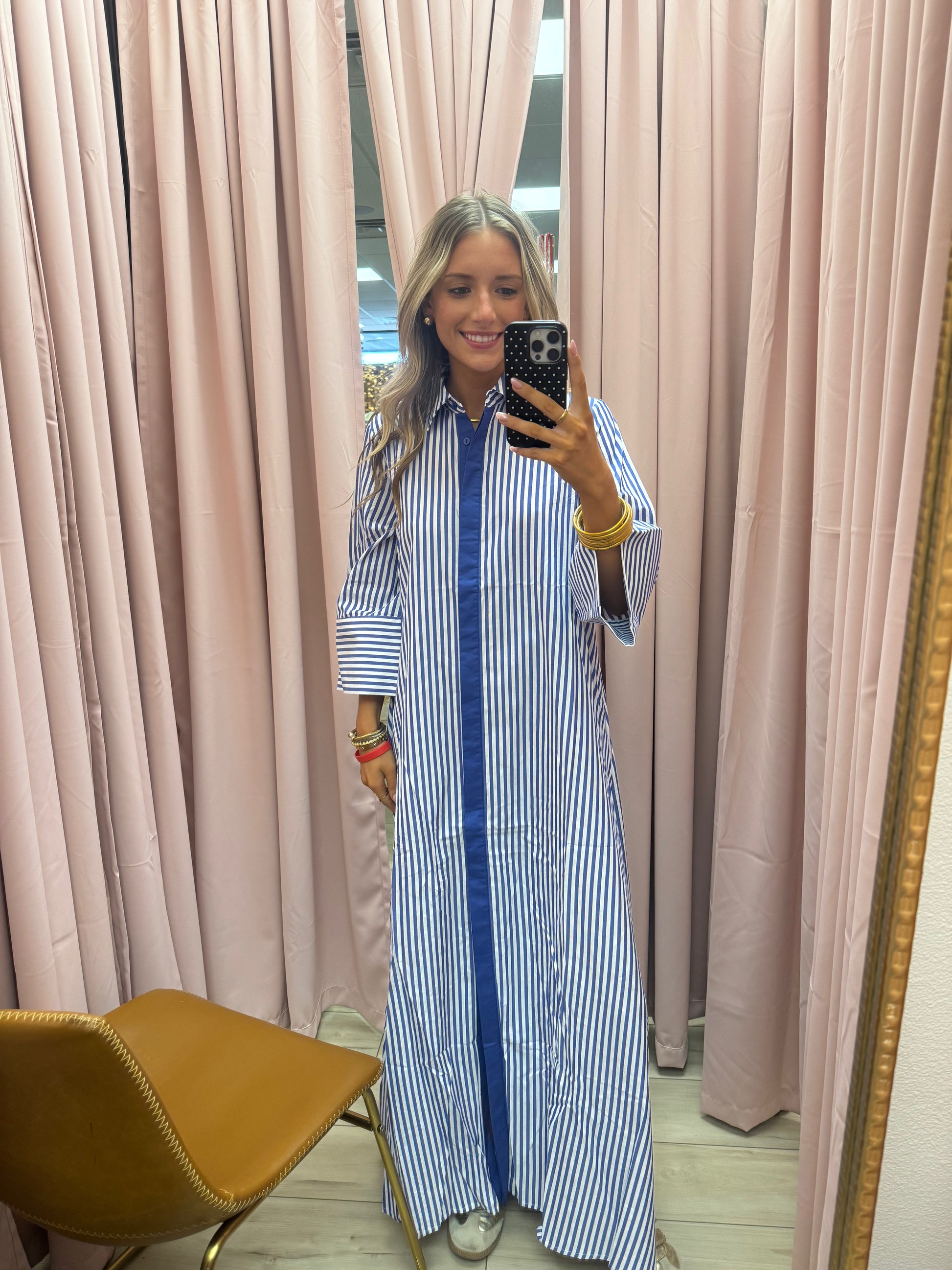 Effortless and elevated, our business casual striped maxi shirt dress is a fall wardrobe must-have. Featuring a loose, relaxed fit and classic vertical stripes, this dress offers a flattering silhouette that transitions seamlessly from the office to after-hours events. The maxi length and button-front design keep it polished, while the breathable fabric ensures all-day comfort. Perfect for work meetings, special occasions, or weekend outings, this versatile piece pairs beautifully with boots or heels for a chic seasonal look. Shop Torque Fashion Boutique for timeless fall dresses that work as hard as you do
