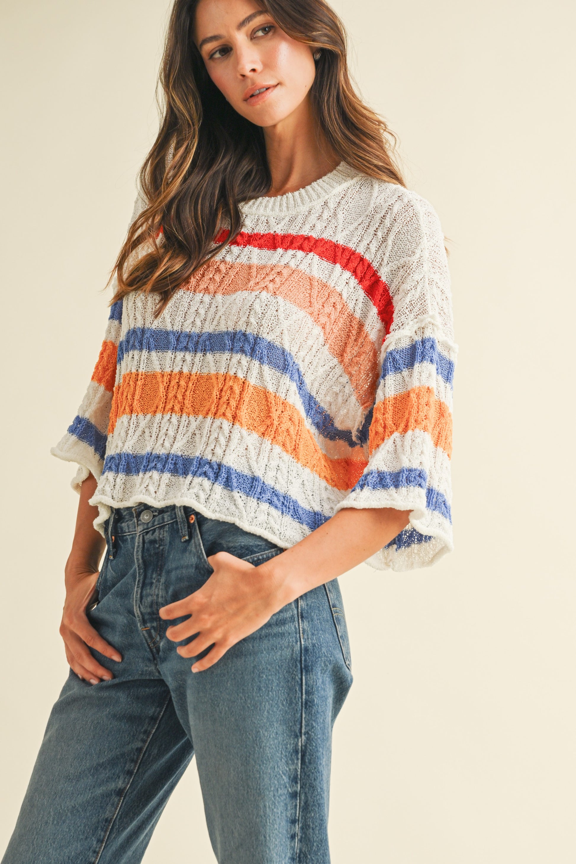 Bring on the crisp air with our multi-stripe cable textured sweater top, perfect for fall transition days and cozy autumn weekends. Featuring a classic cable knit texture and playful multi-color stripes, this sweater top adds a pop of personality to your seasonal wardrobe. Its relaxed fit makes it easy to layer over tanks or under jackets, creating endless outfit options. Pair with jeans, skirts, or leggings for a casual yet polished look. Shop Torque Fashion Boutique for cozy, chic sweaters to carry you through fall in style.