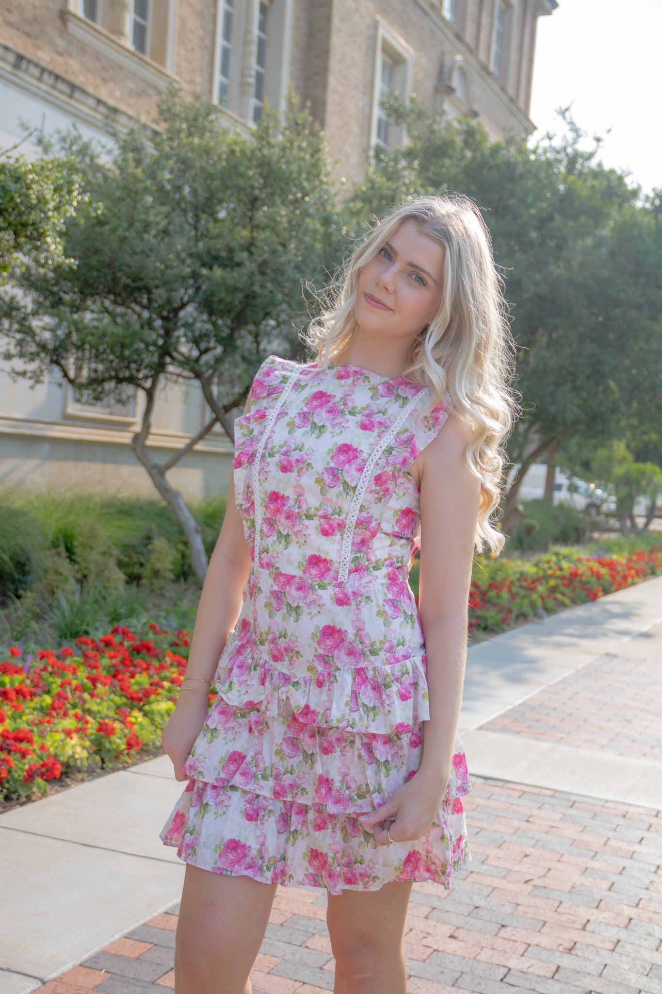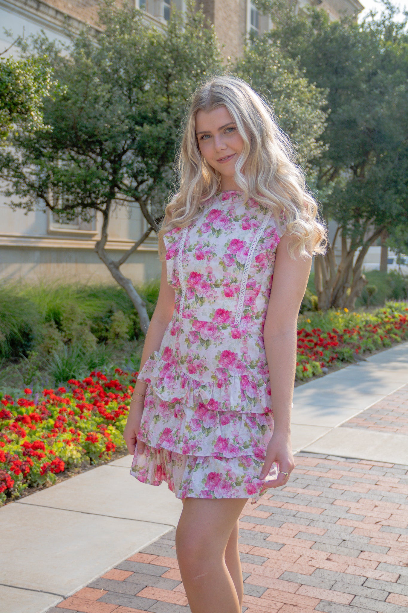 Floral printed sleeveless dress with a tiered ruffle skirt. Featuring a concealed back zipper