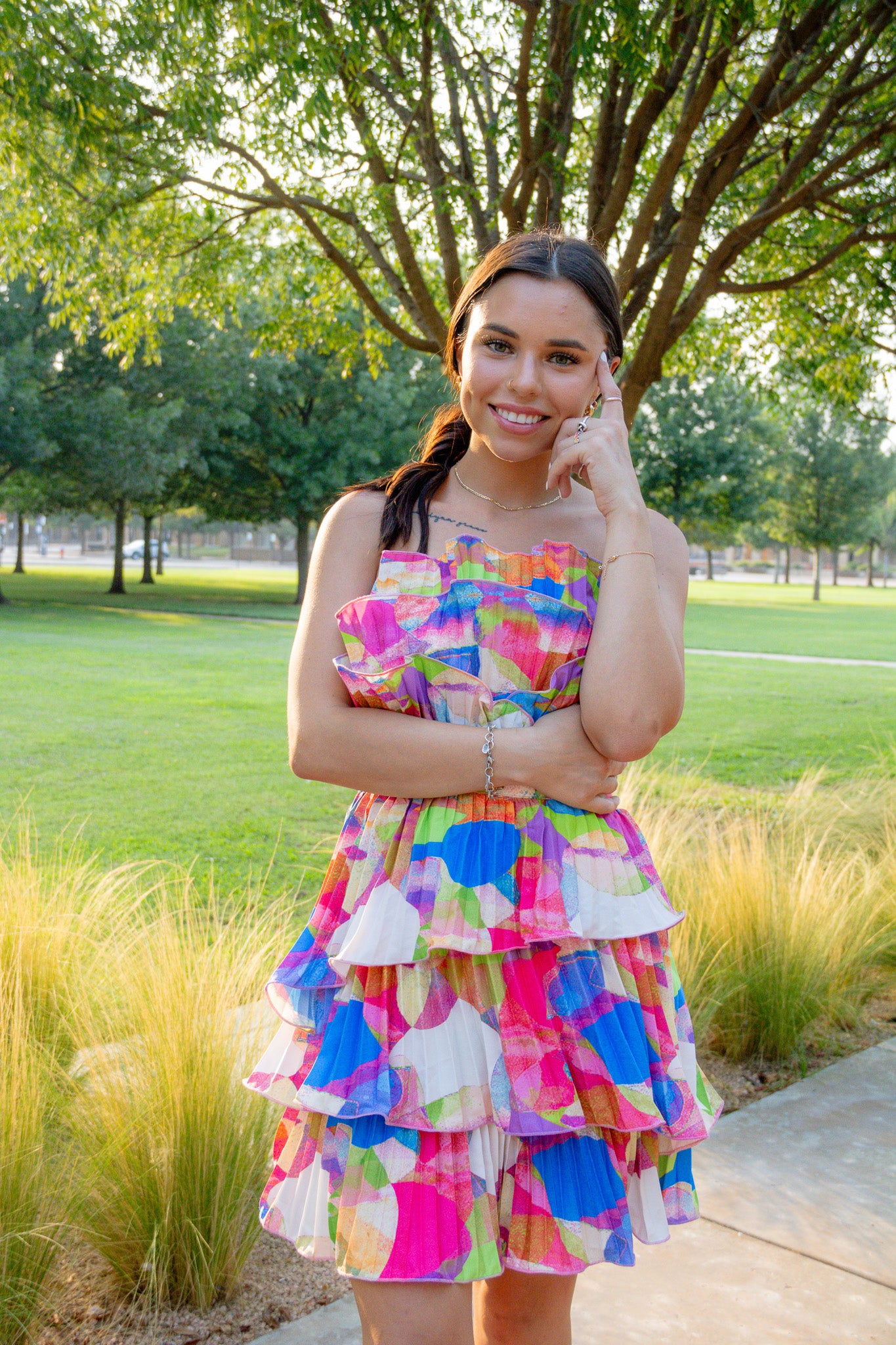 A printed woven mini dress featuring strapless neckline, layered pleated body and side zipper closure