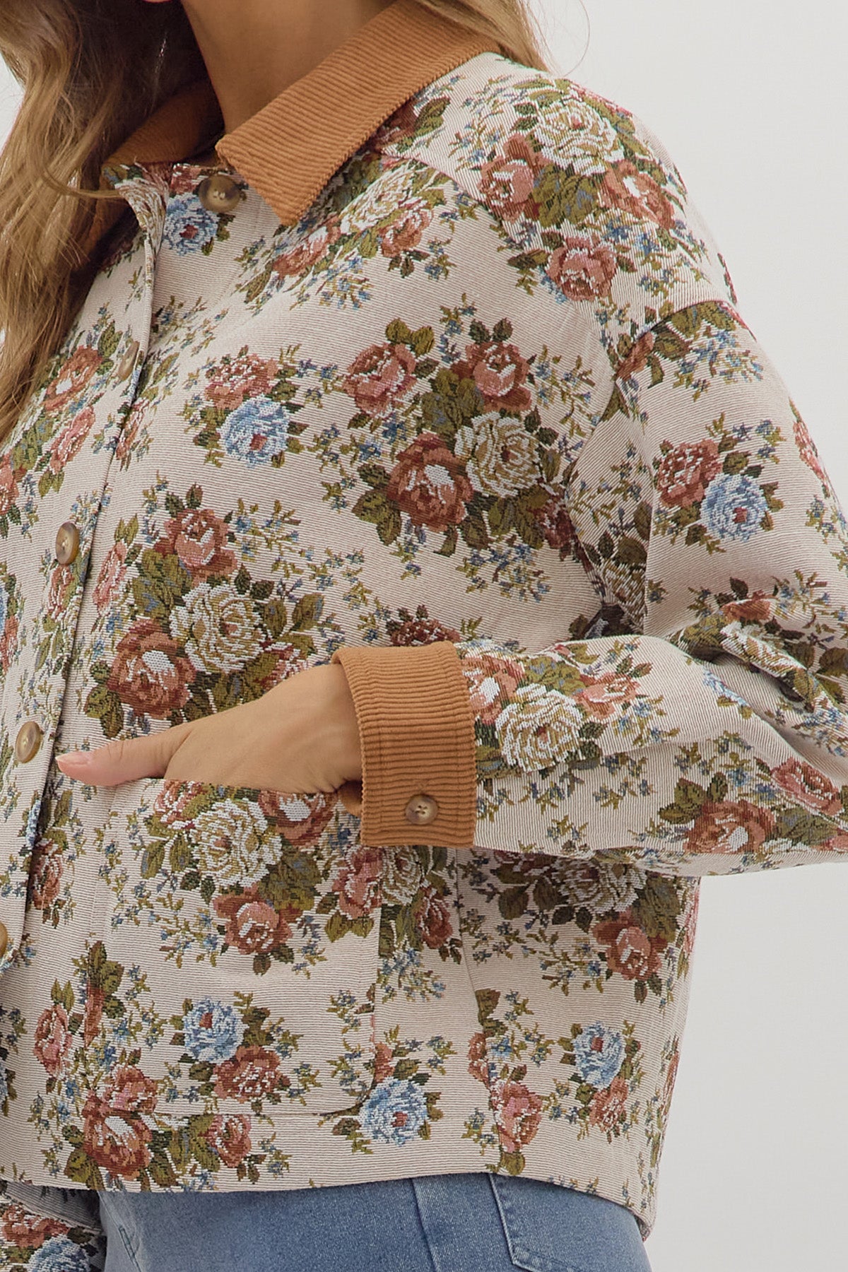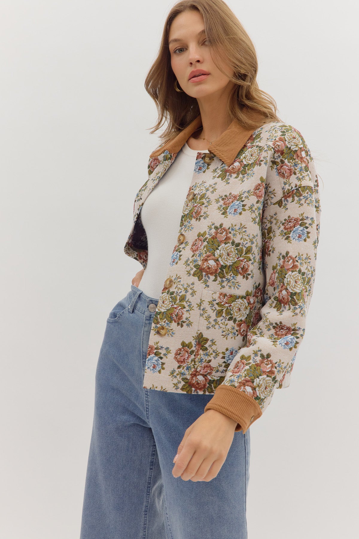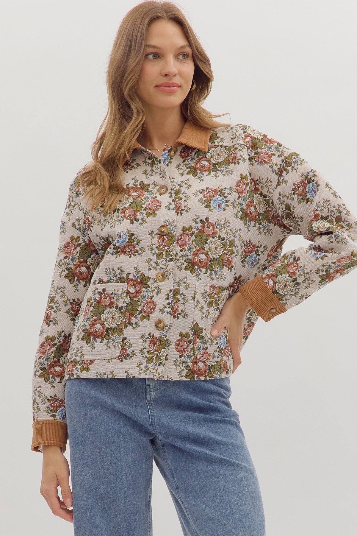 Step into autumn with our floral quilted jacket, a cozy yet chic outerwear piece that’s perfect for layering. Featuring an allover botanical print, contrast corduroy collar and cuffs, and functional front buttons, this jacket blends vintage charm with modern comfort. Side patch pockets add practicality, while the medium-weight woven fabric keeps you warm on crisp fall days. Pair it with jeans, boots, and your favorite scarf for a polished, seasonal look. Shop Torque Fashion Boutique for fall jackets that combine style and function.