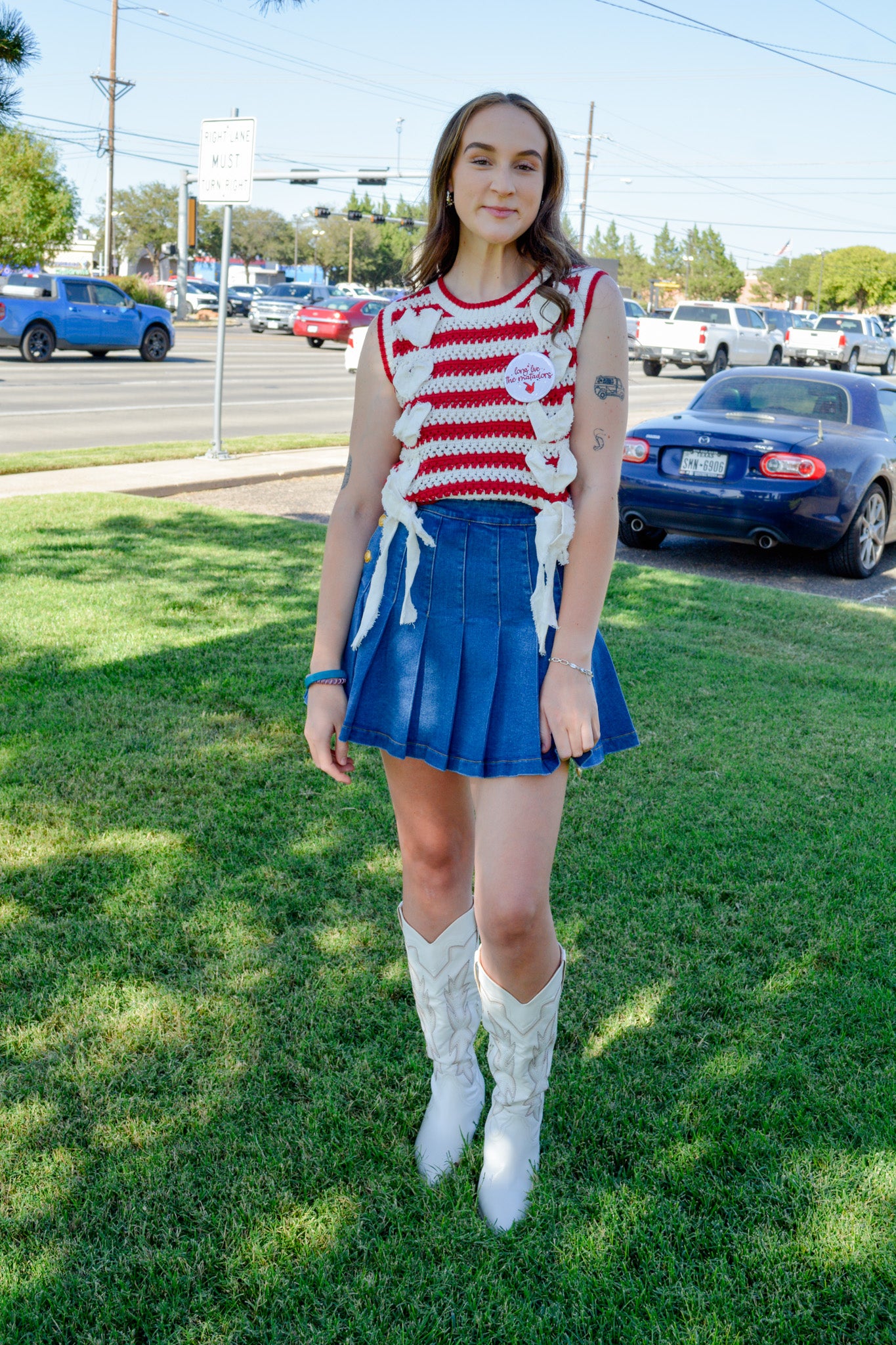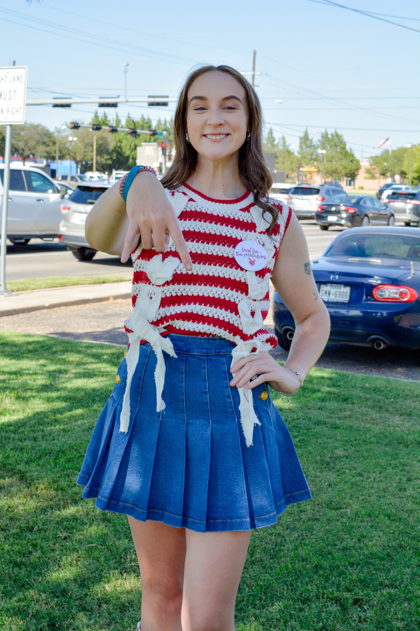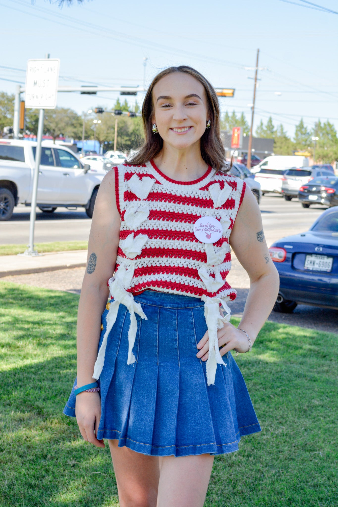 Layer up this fall with our stylish frayed twill vest sweater, designed for game day and beyond. Featuring delicate lace straps, a chic bow tie detail, and bold stripes, it’s the perfect piece to transition your wardrobe into cozy season. The round neck and relaxed fit make it easy to style over your favorite long sleeves, adding a trendy, feminine touch to your gameday look.