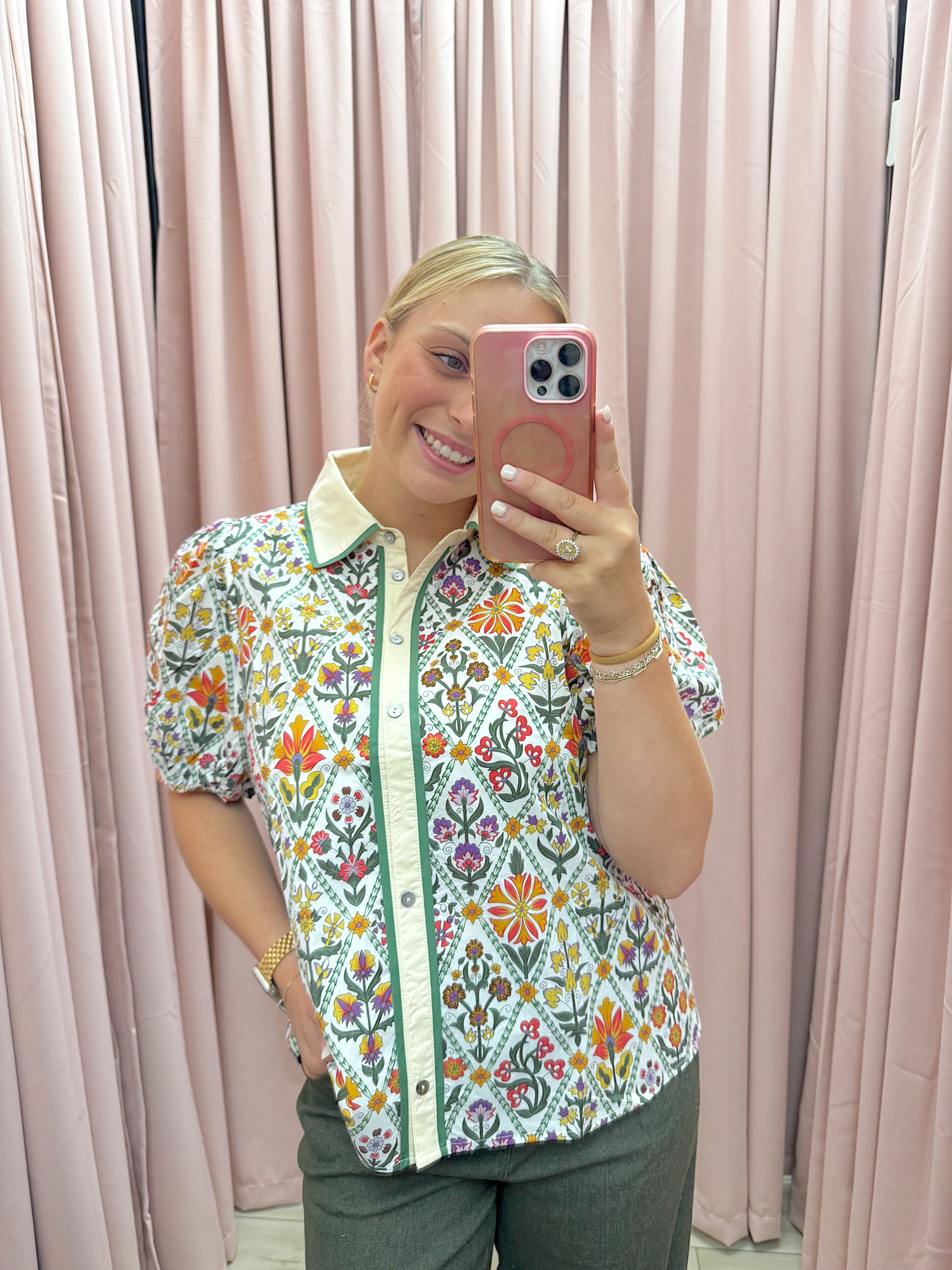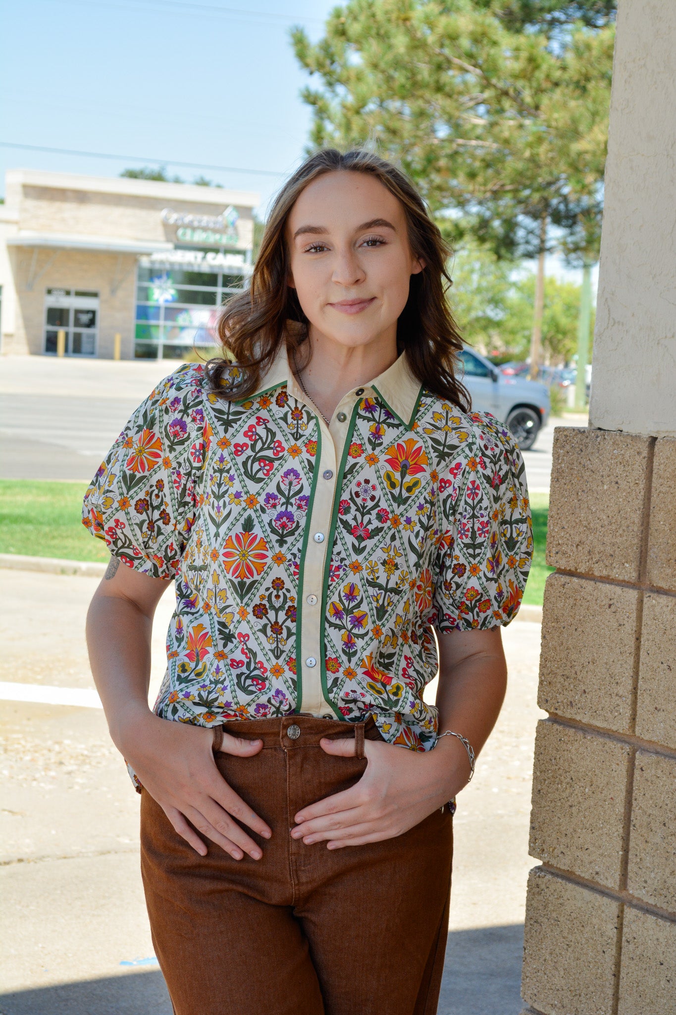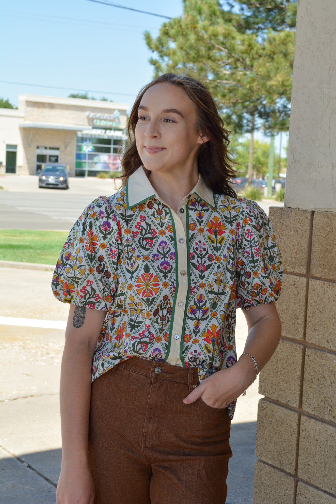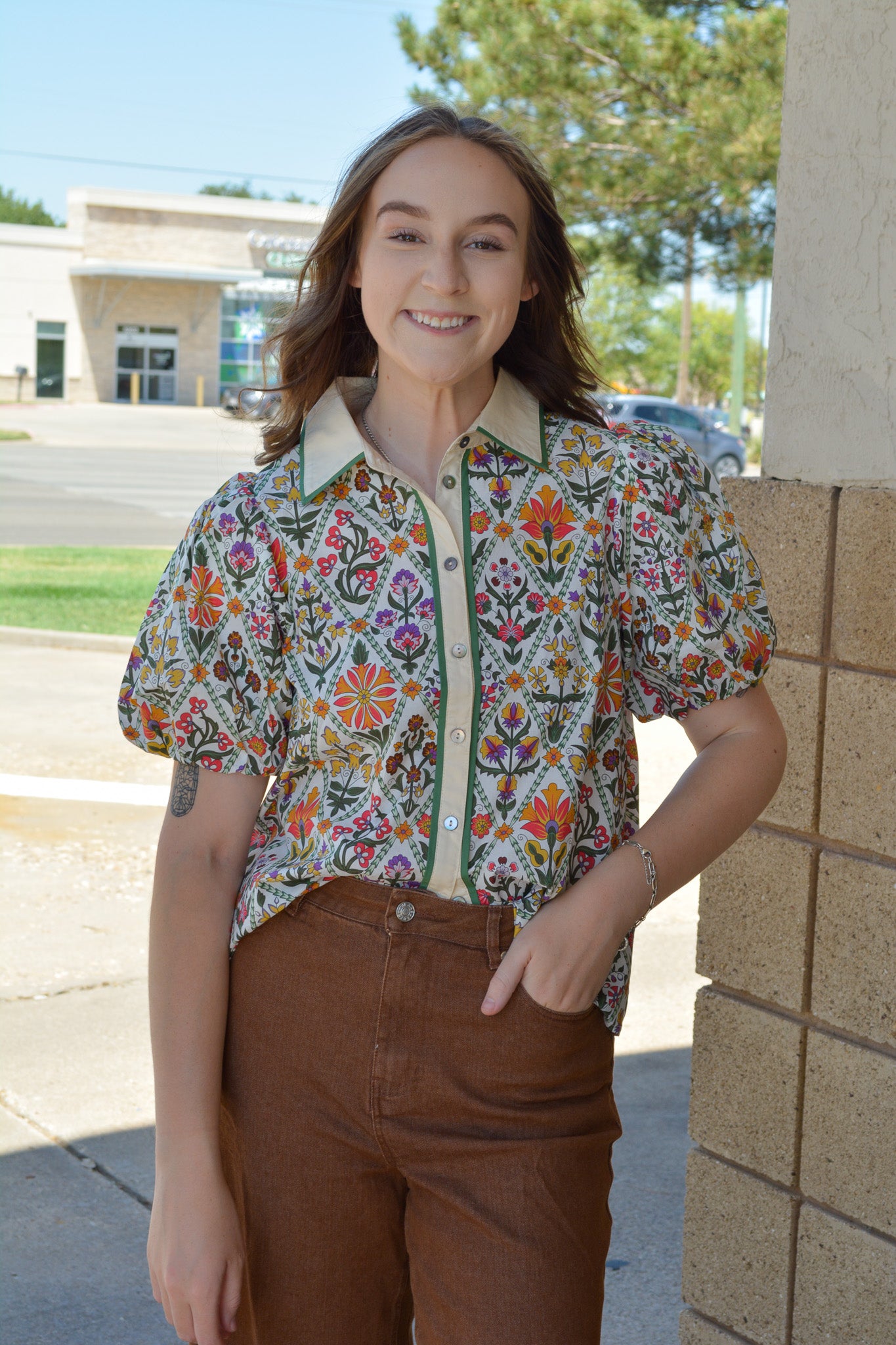 fall floral tops for women, diamond pattern blouse, bubble sleeve top, button up fall blouse, contrast collar shirt, boutique fall fashion, preppy fall outfit ideas, lightweight woven tops for autumn