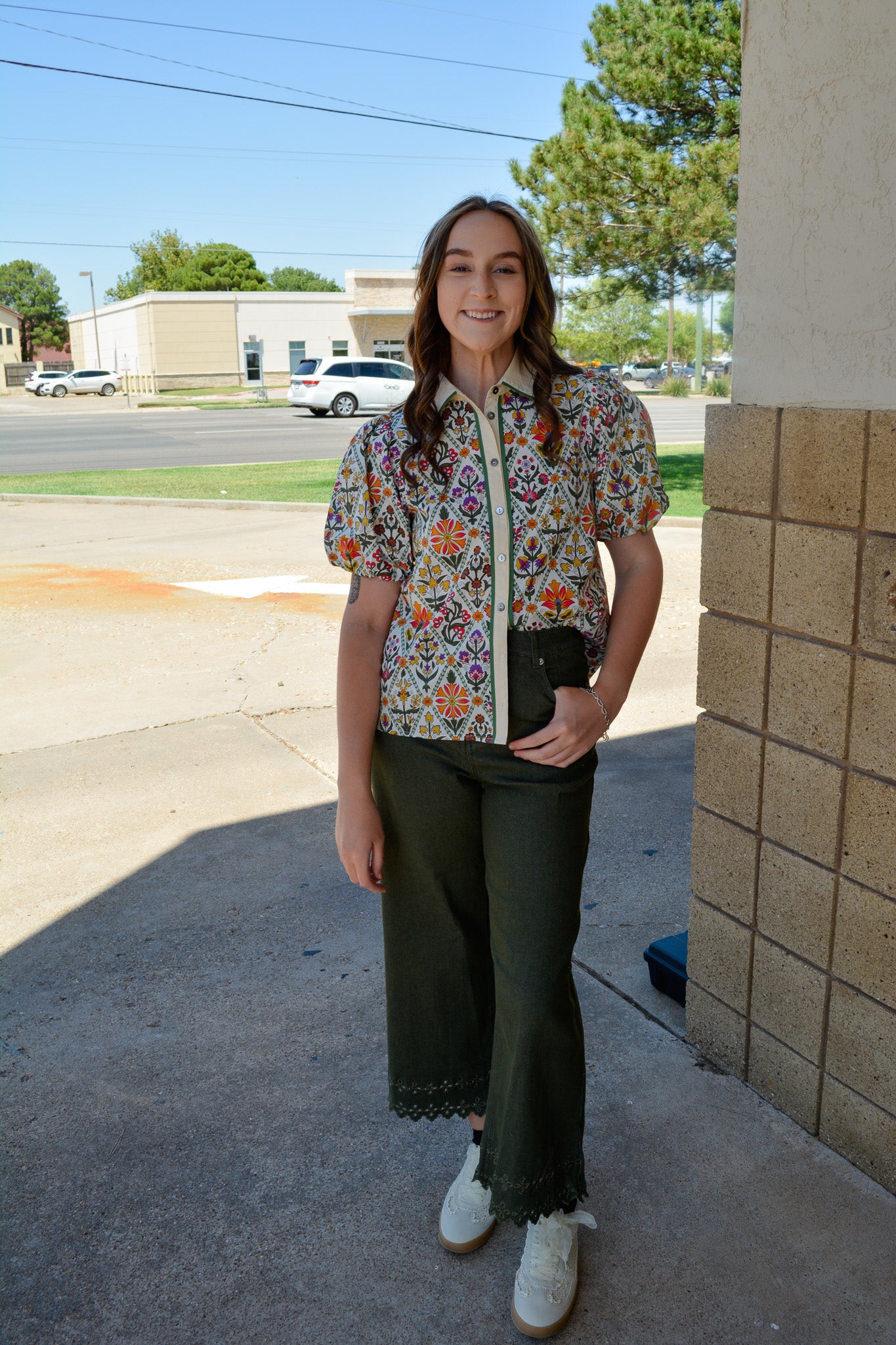 Fall florals get a playful twist with this diamond-patterned bubble sleeve top. Featuring a soft floral print, short bubble sleeves, and a bold contrast accent collar with a button-up placket, this lightweight woven blouse adds instant charm to your autumn wardrobe. The structured collar gives it a preppy edge, while the flowy silhouette keeps things comfortable and effortlessly stylish. Perfect for pumpkin patch outings, cozy coffee dates, or layering under a denim jacket on crisp fall days.