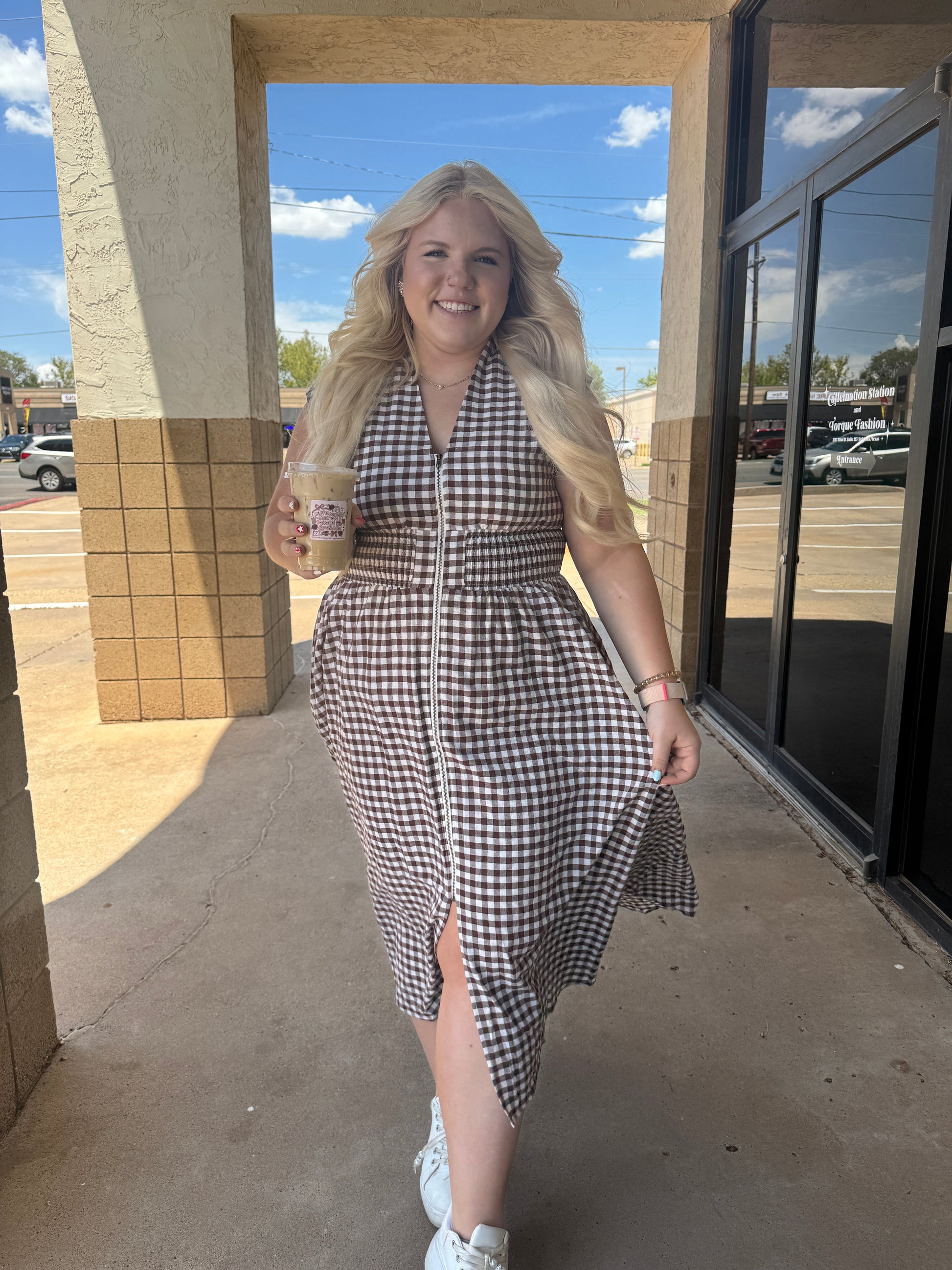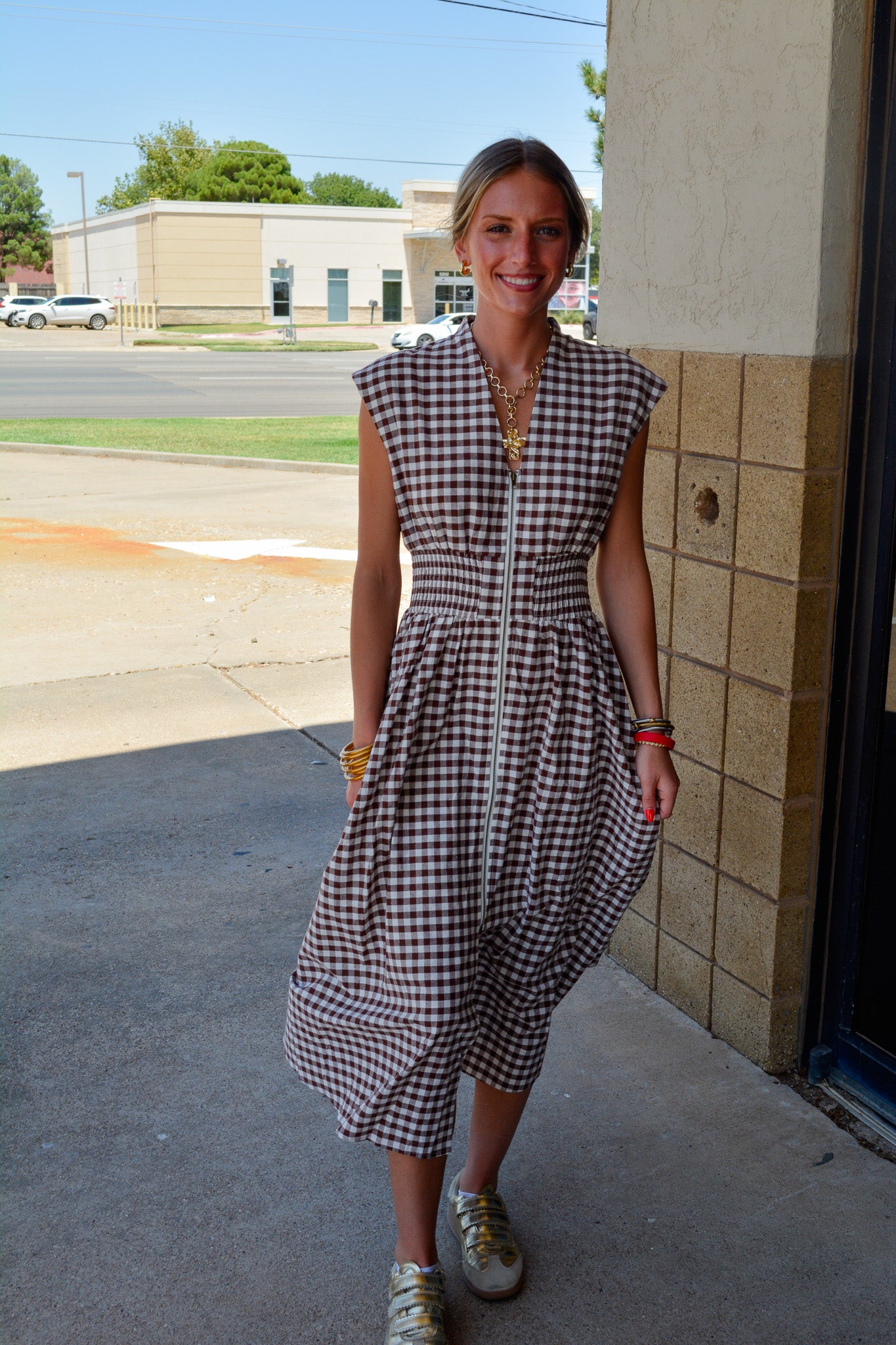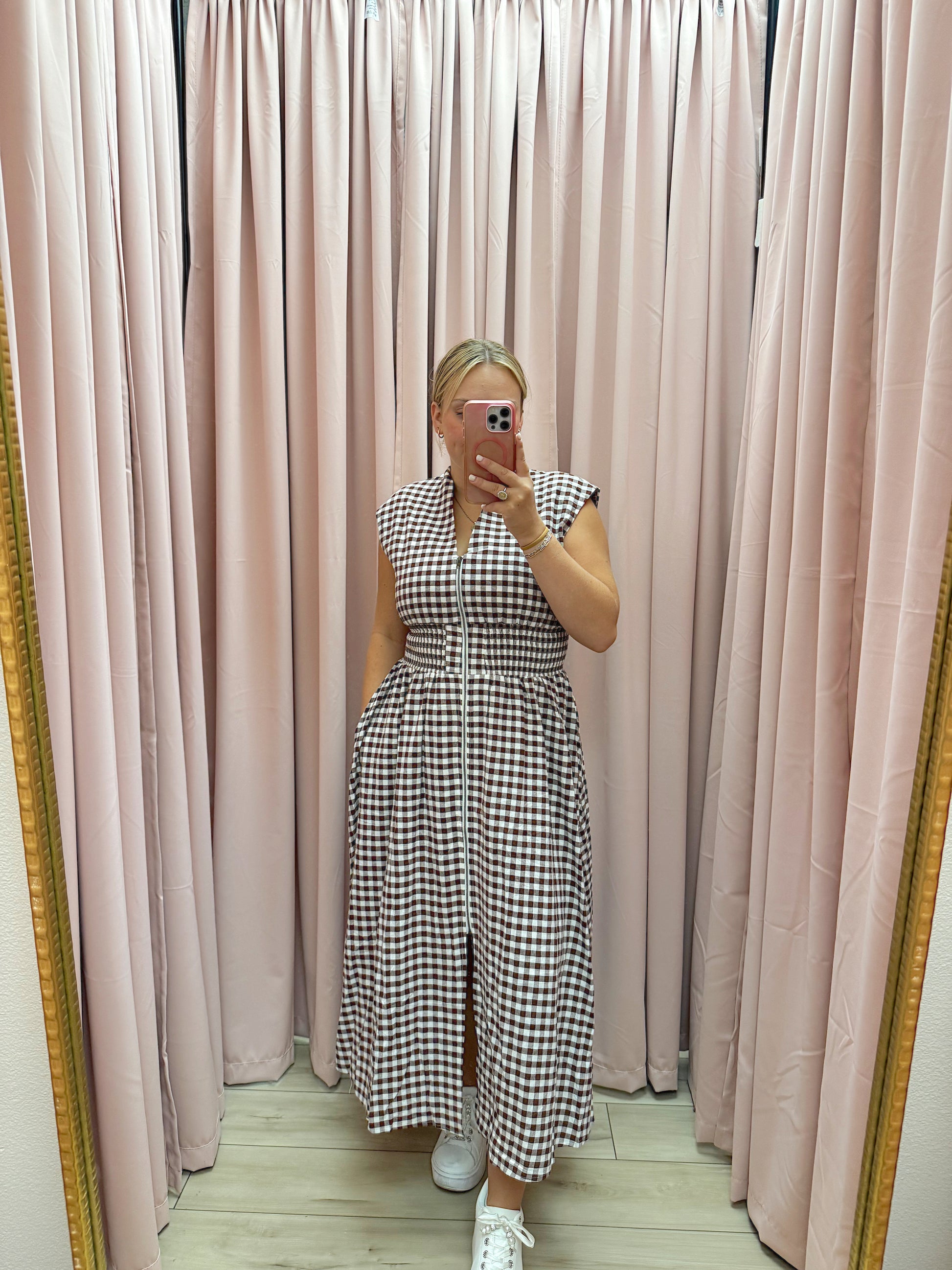 Fall in love with timeless charm 🍂 This gingham-patterned V-neck midi dress is the perfect transitional piece for pumpkin patch days and cozy café dates. Featuring a flattering smocked waist and functional front zipper, it combines comfort with effortless style. The sleeveless cut makes it ideal for layering under cardigans or denim jackets. Bonus: it has pockets (yes, really)!