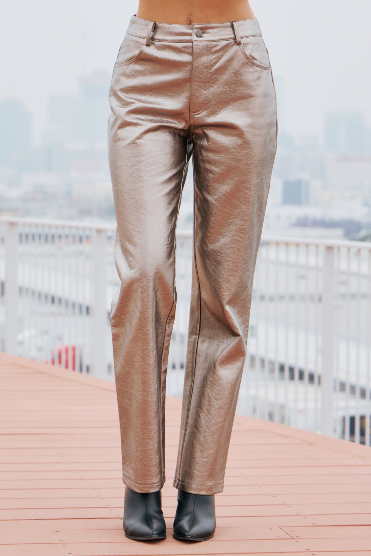 A sleek true retro-inspired straight pants featured in a metallic cotton faux leather fabrication with pockets and belt hoops.