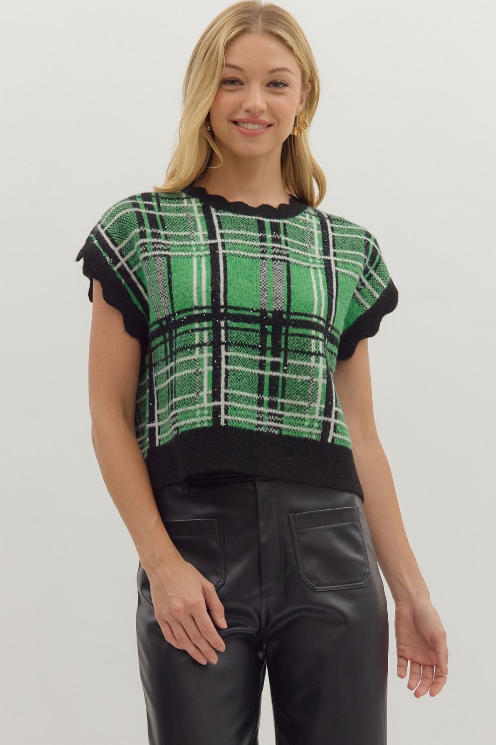 Celebrate the season in cozy style with this plaid short sleeve sweater knit top, featuring delicate scallop trim and a ribbed hem for a polished finish. The classic plaid pattern gives off festive winter vibes, while the lightweight knit makes it perfect for layering under your favorite coat or pairing with high-waisted trousers for a chic holiday look. Ideal for office parties, casual Christmas gatherings, or cozy coffee dates.