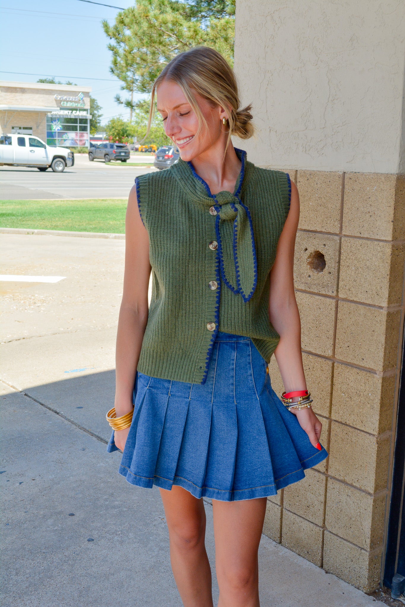 Add a cozy twist to your summer-to-fall wardrobe with this sleeveless sweater knit top. Featuring a button front, stylish knot closure, and accent blanket stitching, this lightweight knit offers the perfect blend of structure and softness. Whether layered under a jacket or worn solo, it’s a versatile must-have for transitional styling.