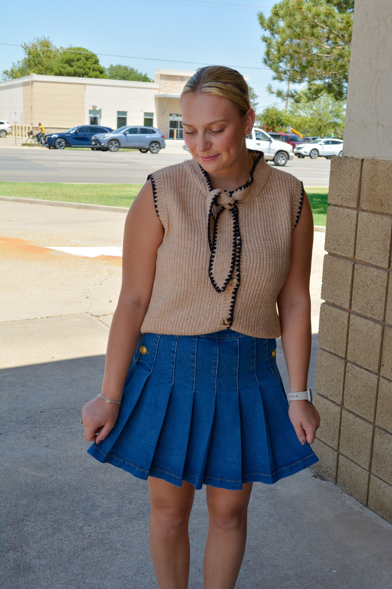 Add a cozy twist to your summer-to-fall wardrobe with this sleeveless sweater knit top. Featuring a button front, stylish knot closure, and accent blanket stitching, this lightweight knit offers the perfect blend of structure and softness. Whether layered under a jacket or worn solo, it’s a versatile must-have for transitional styling.