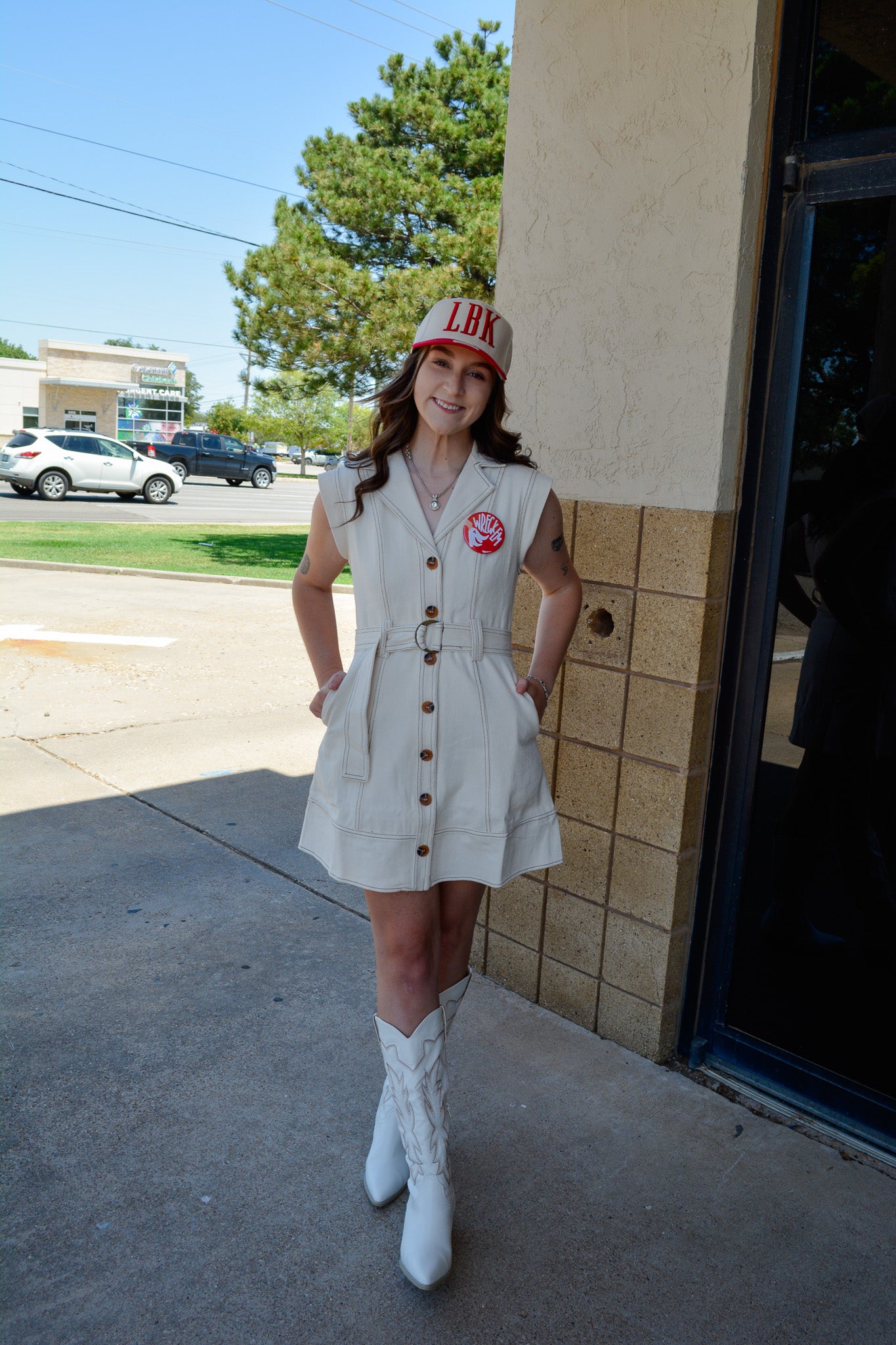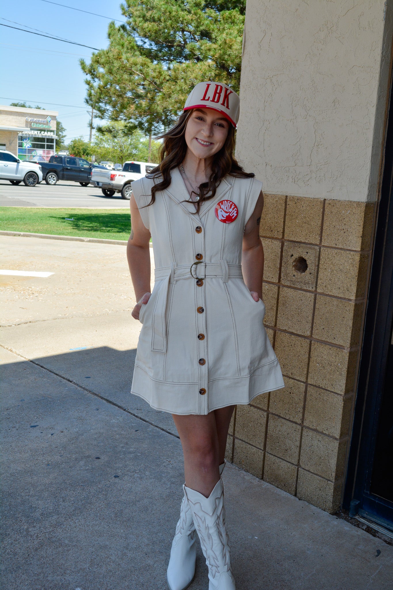Adjustable self-belt cinches the waist