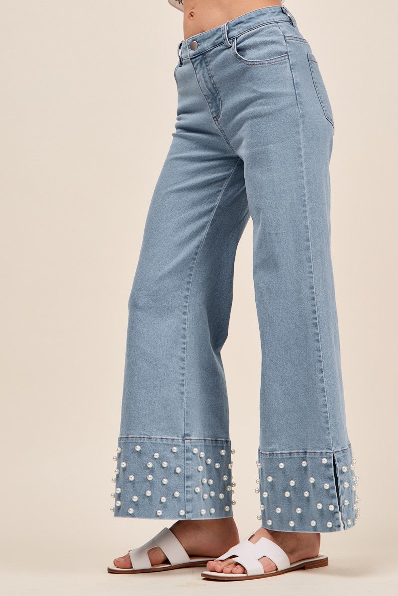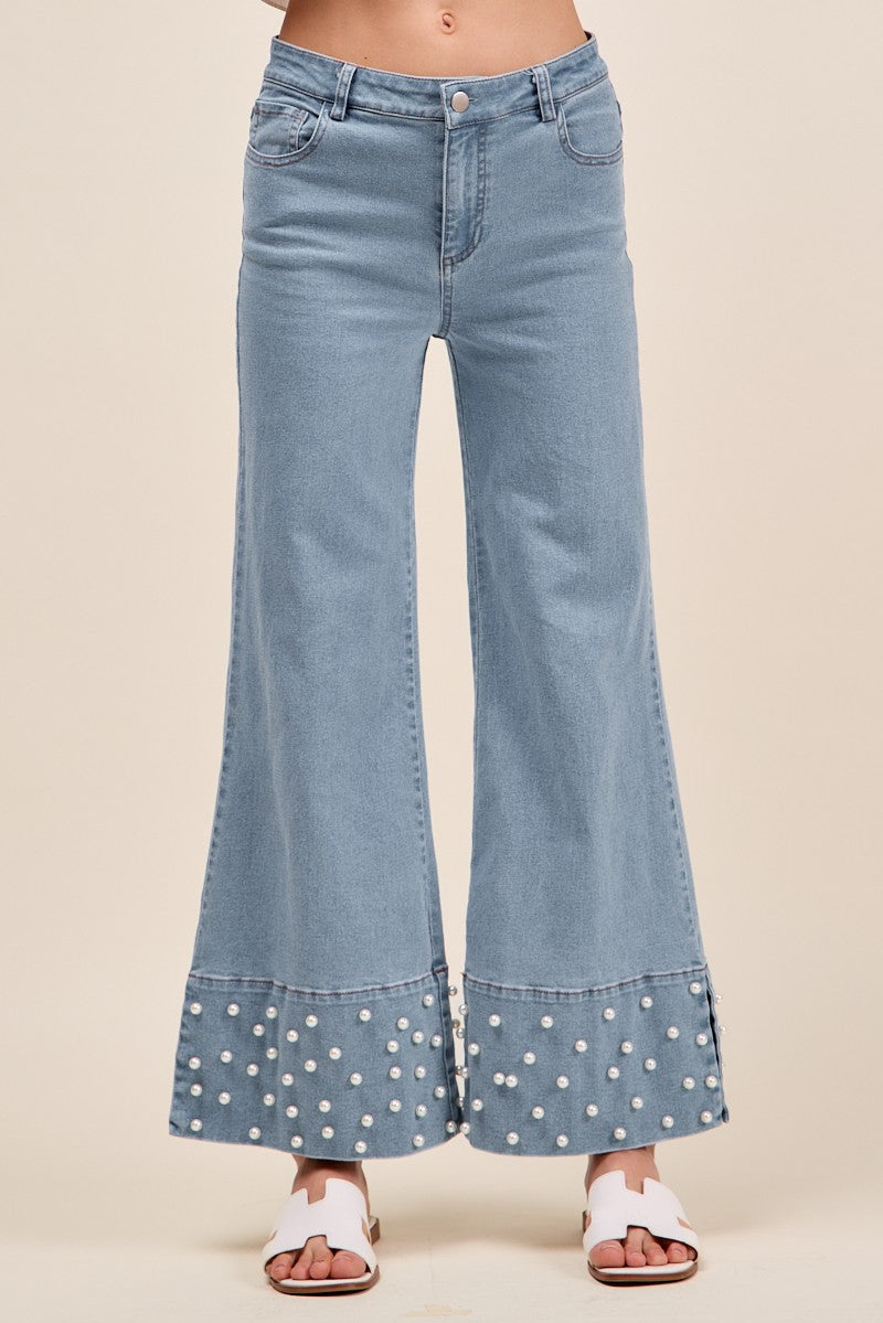 Elevate your everyday denim with our Mid Rise Jeans with Side Slits and Pearl Embellishments — a chic twist on a wardrobe classic. Crafted from a soft-yet-structured denim blend, these jeans feature delicate pearl accents along the hem for a touch of elegance, while subtle side slits add movement and a flattering drape over your shoes.