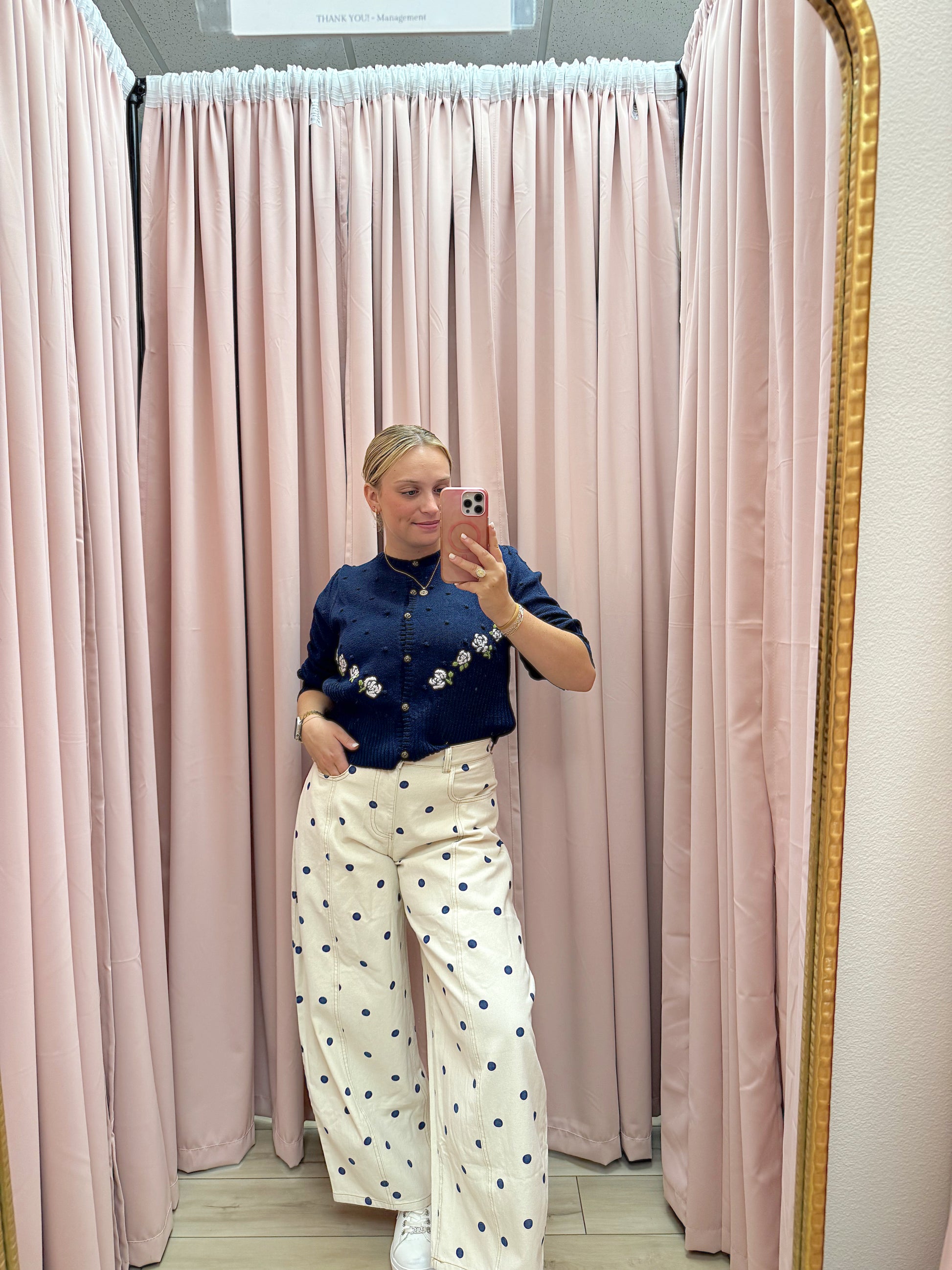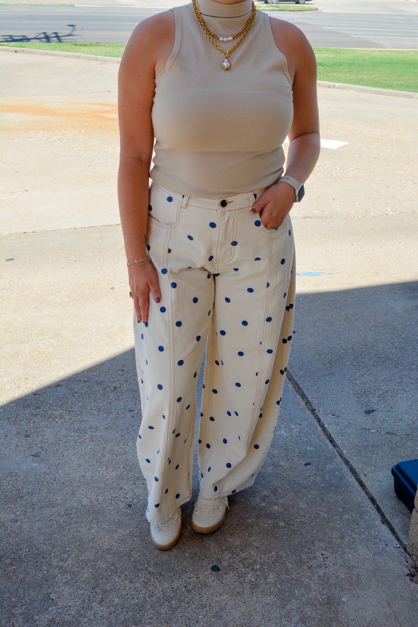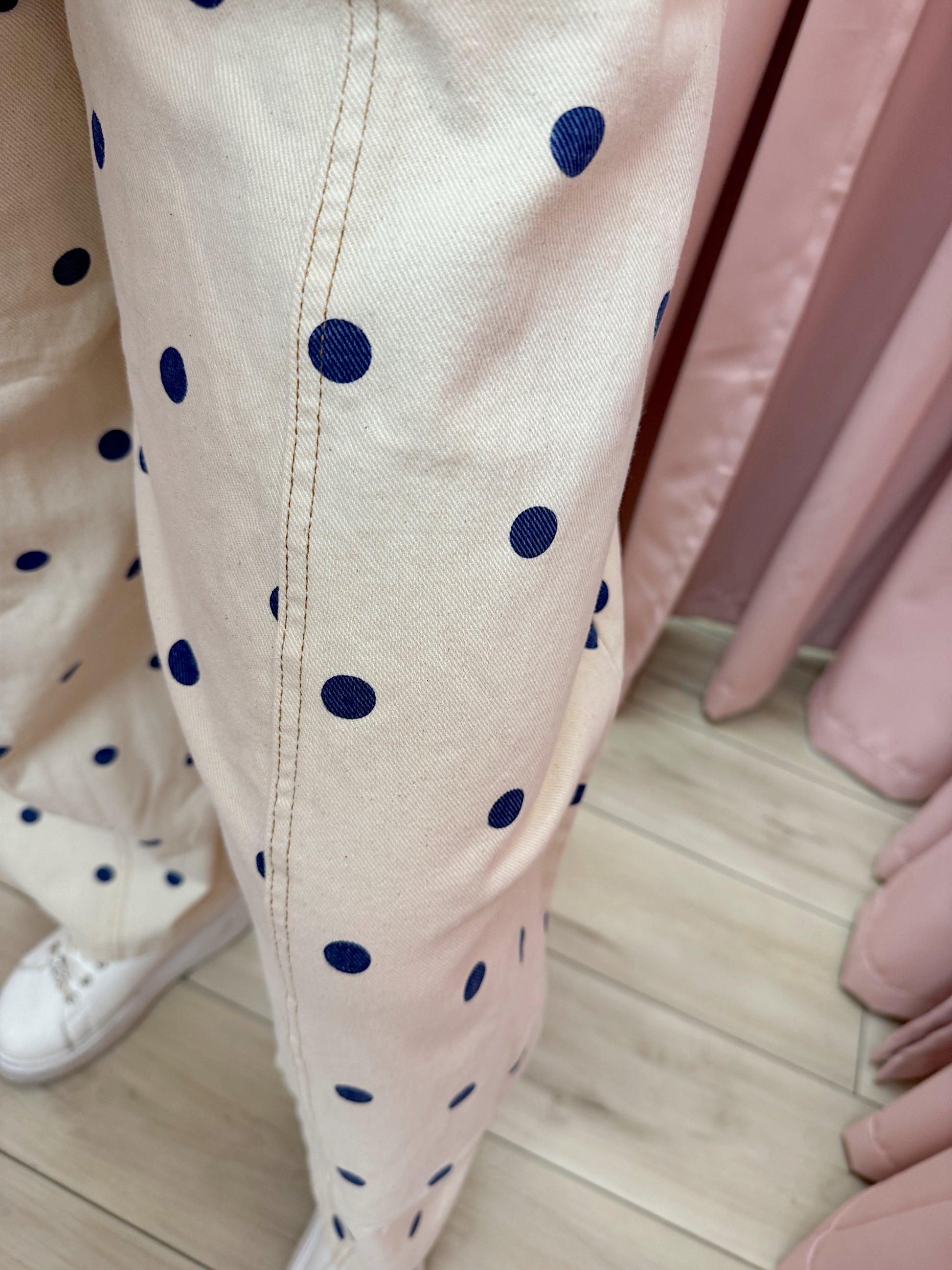Make a playful statement with these wide-leg denim pants featuring a charming polka dot print. The relaxed fit offers comfort and style, perfect for fall layering or casual weekends. Pair with a fitted top or chunky sweater to balance the silhouette and keep your look trendy and fun.