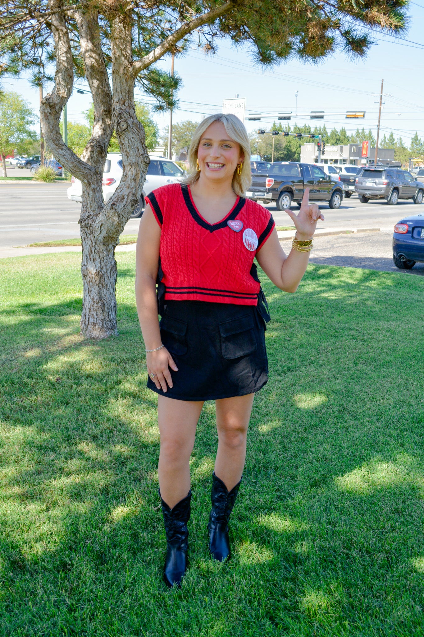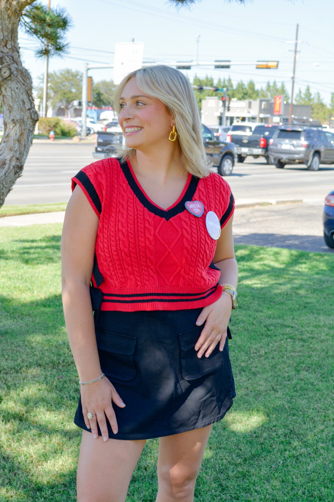 Show your team spirit in style with this red and black V-neck sweater vest featuring sporty stripes and flirty bow details. The soft knit and flattering fit make it a comfy-cute choice for layering over tees or button-downs on chilly game days. Whether you're tailgating or heading out with friends, this preppy-meets-playful piece brings the perfect mix of fierce and feminine to your fall lineup.