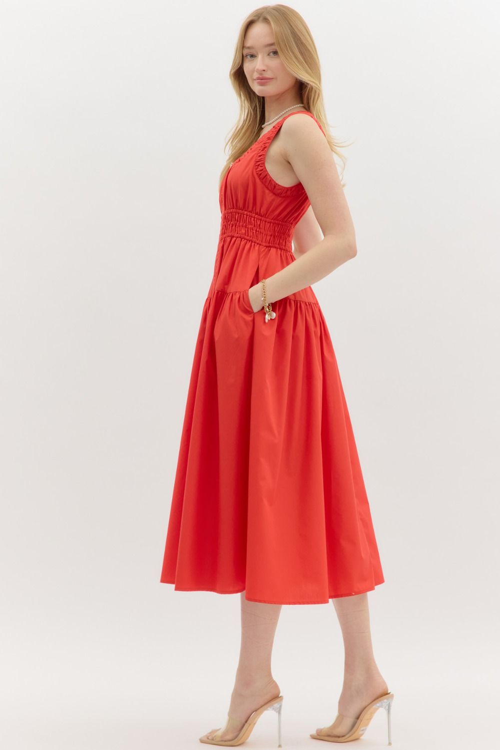 Solid ruching band accented square neck sleeveless midi dress featuring elasticated waist. Gold accented zipper closure at front. Pockets at sides. Lined. Woven. Non-sheer. Lightweight.