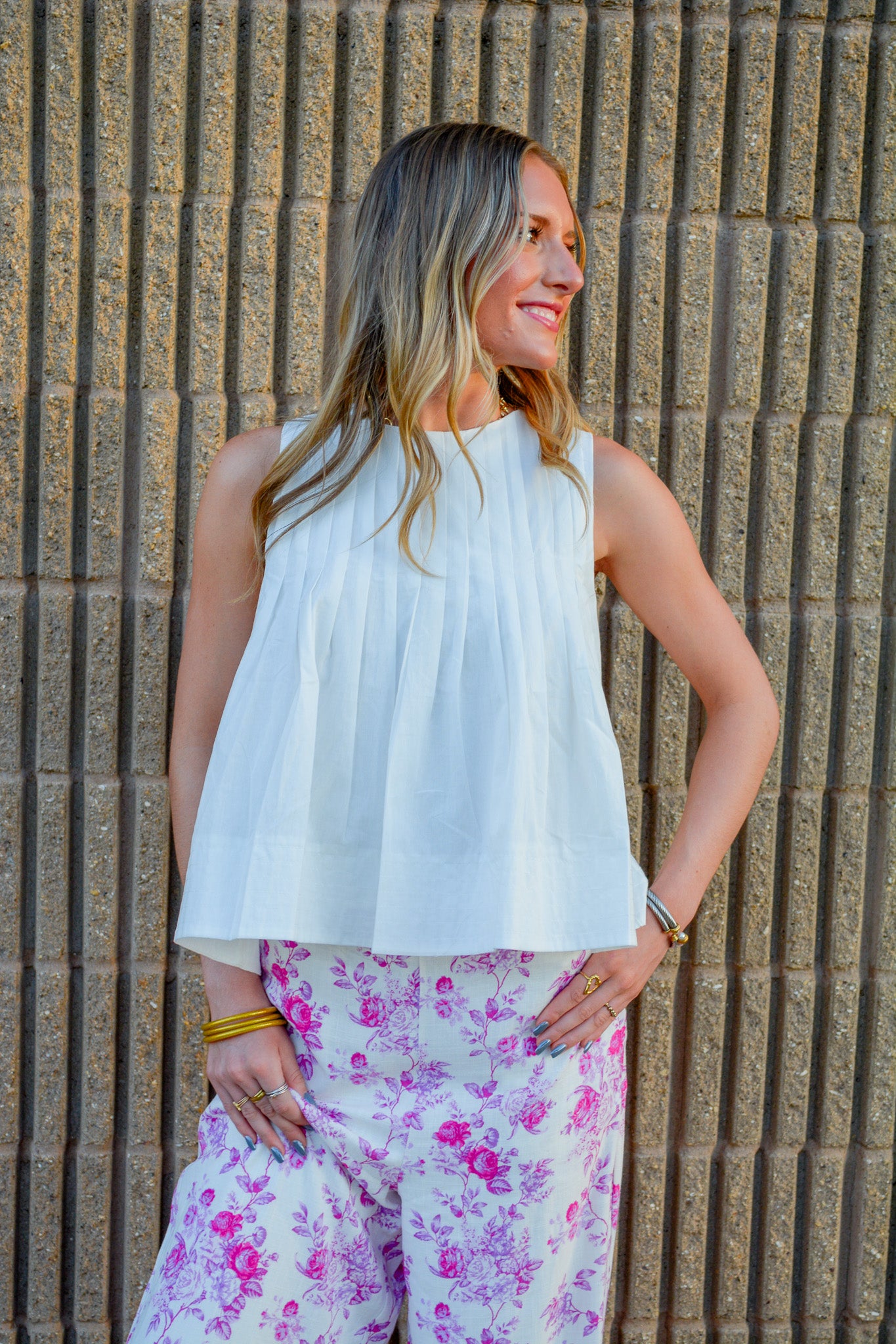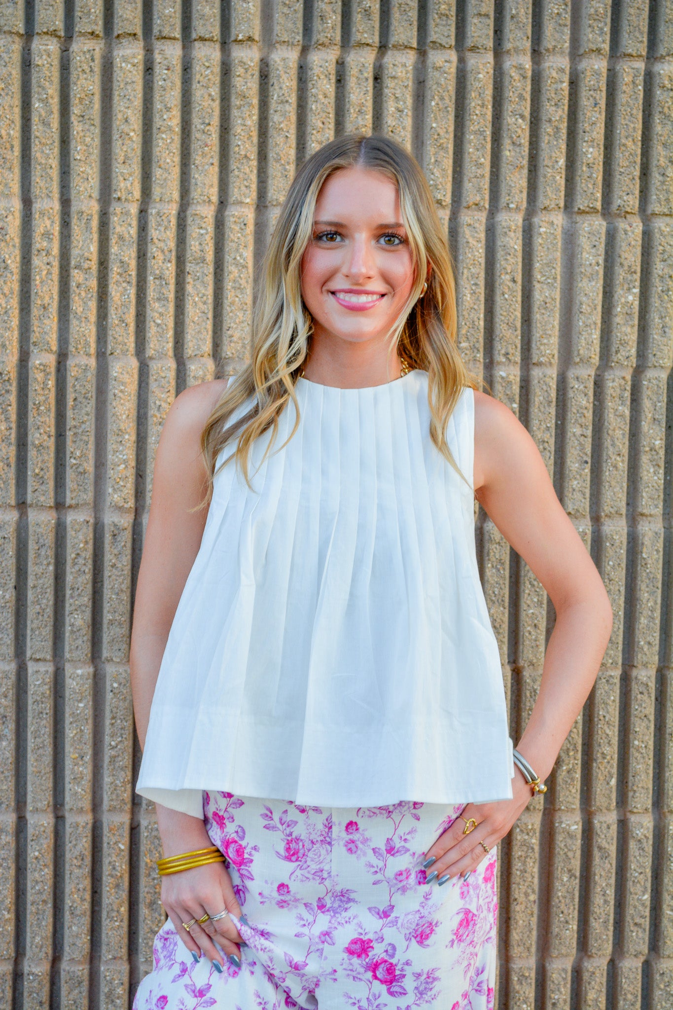 High-low sleeveless top with pleated detailing and concealed back zipper.