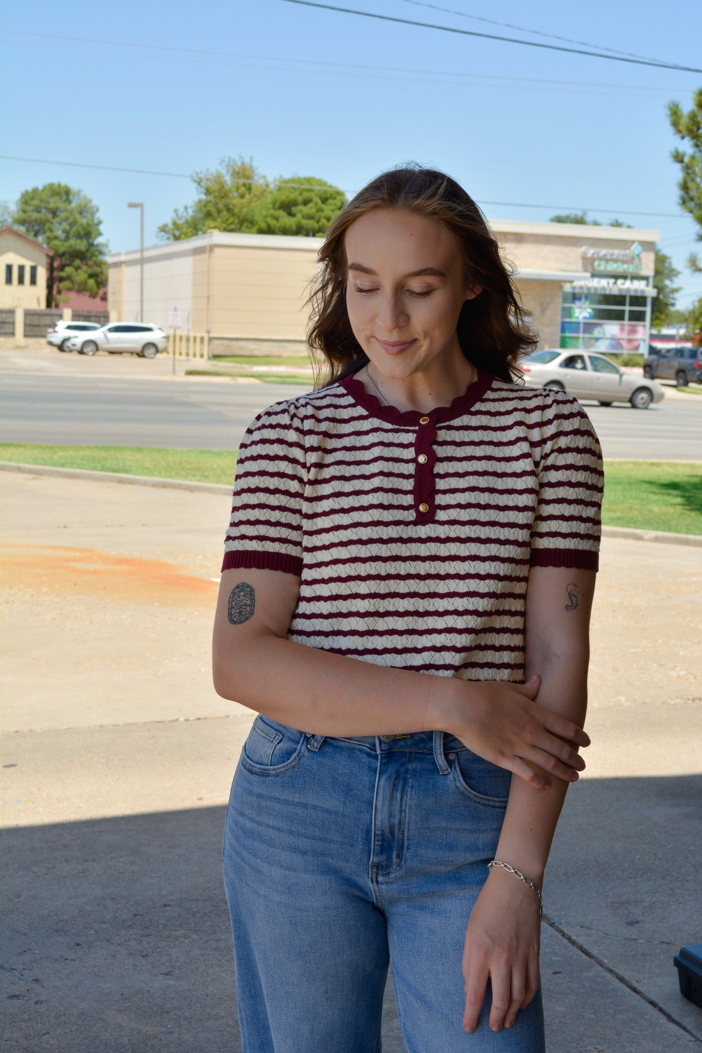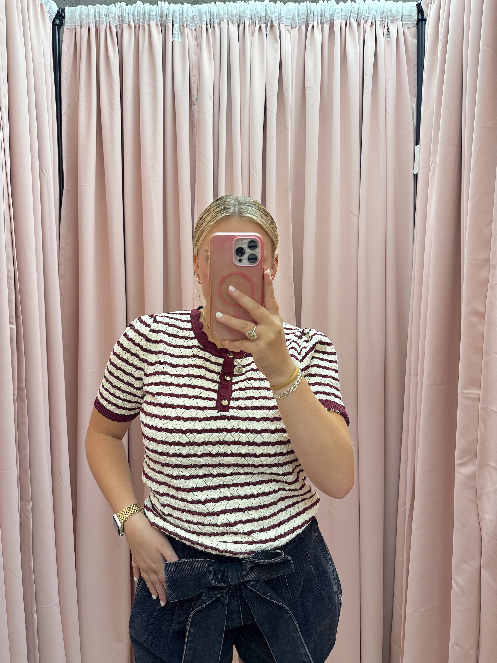 striped knit top fall 2025, pointelle sweater tee, scallop edge boutique top, sheer knit button top, trendy lightweight sweater, fall rush outfit idea, boutique layering top