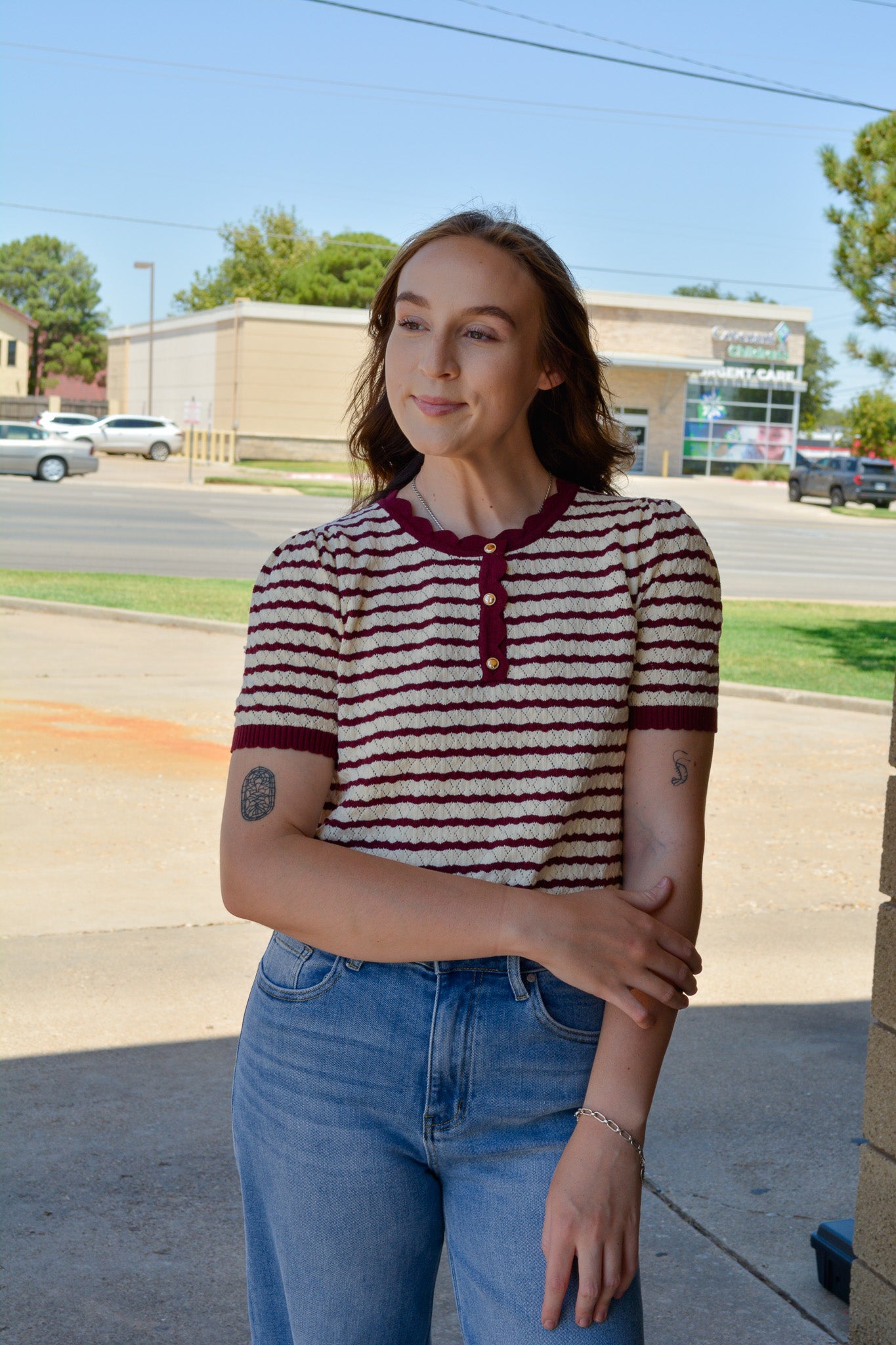 Lightweight, lovely, and full of texture — our Sweet Scallop Knit Top is the definition of soft sophistication. Designed with delicate pointelle striping, scalloped edges, and a button-front closure, this short sleeve sweater knit is perfect for transitional styling. Whether you're heading to class, brunch, or rush events, this top brings vintage charm with a modern twist.