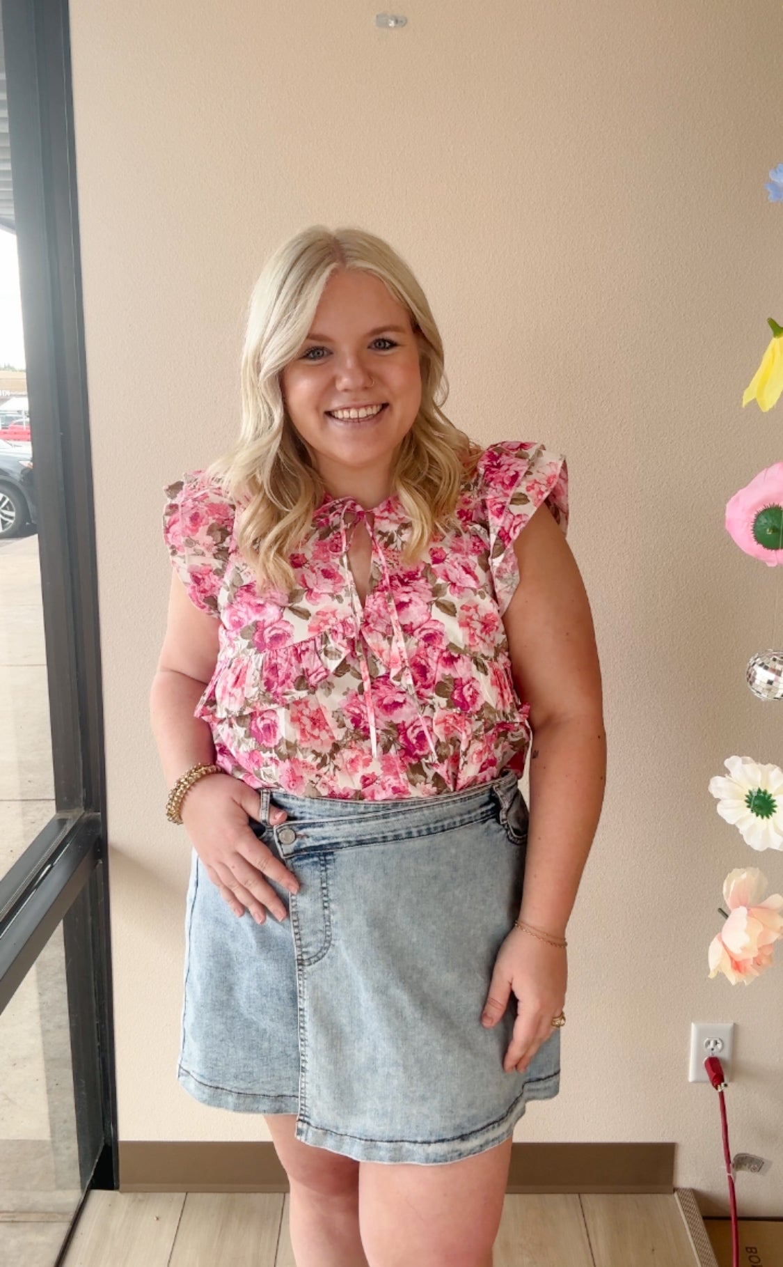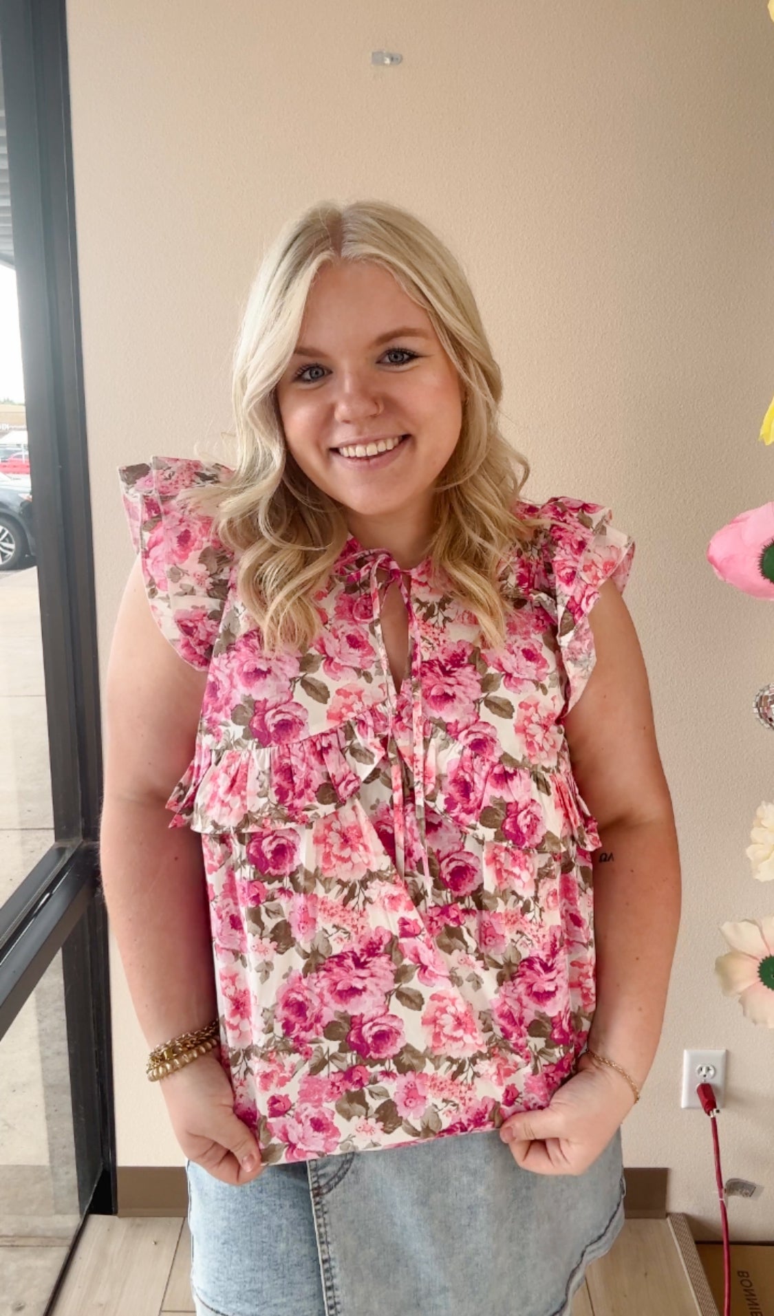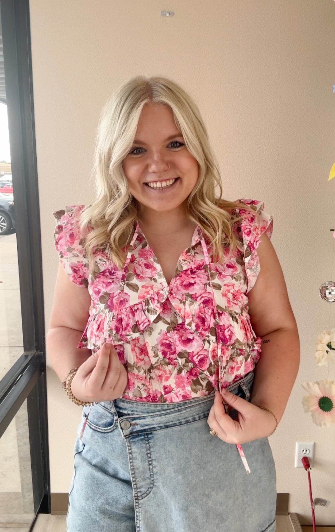 - Floral print ruffled tie front blouse top - Ruffle sleeve - Keyhole on front with tie string - Ruffle detailing on body - Finished with clean hem