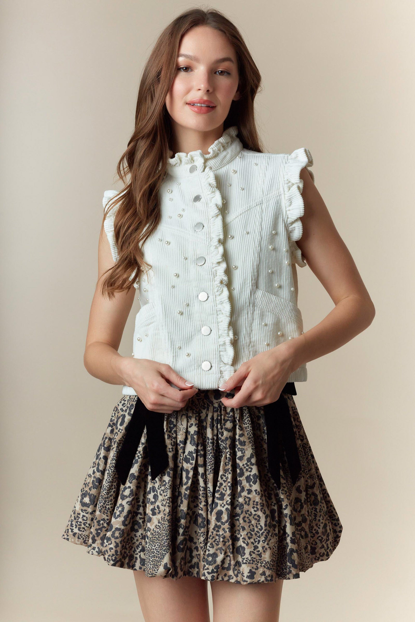 This corduroy crop vest is the ultimate mix of edgy and elegant. Featuring delicate ruffle accents and pearl detailing, it adds a luxe, feminine touch to any fall outfit. The soft corduroy fabric keeps things cozy while the cropped cut brings all the trend-forward vibes. Style it over a long sleeve or turtleneck for a chic, layered look that turns heads.
