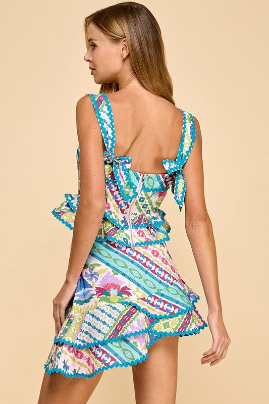 A chic patchwork print tank top with a tiered layered design, ruffle hem, and back zipper closure