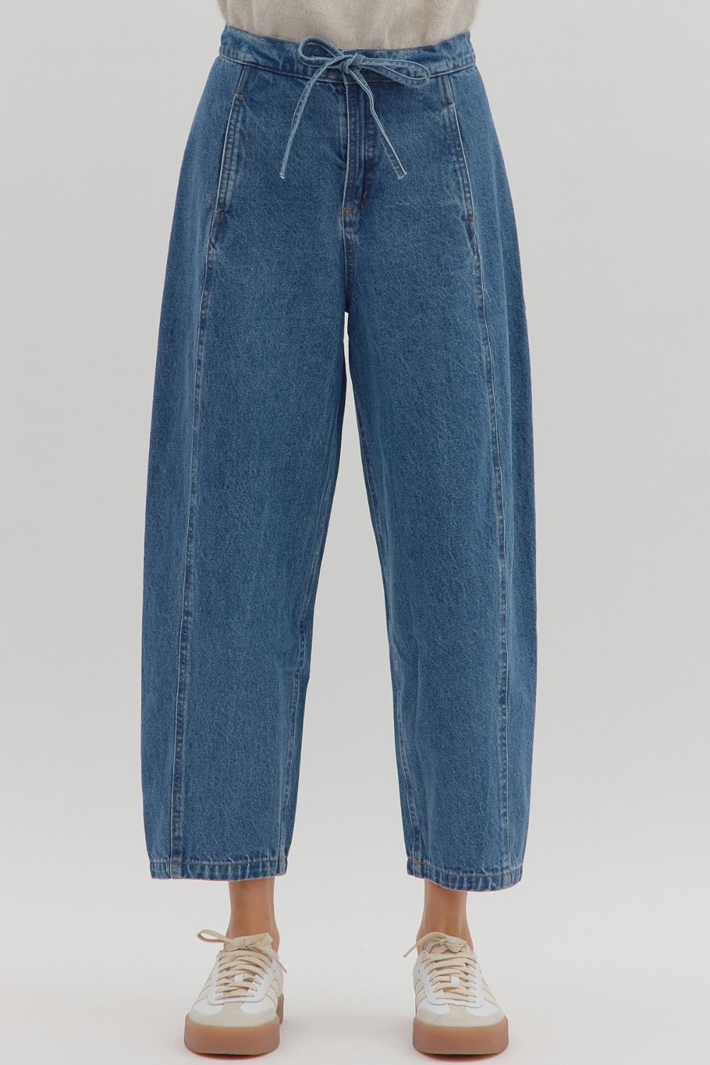 Keywords: high waist denim pants, ankle length jeans, women’s drawstring denim, modern denim trousers