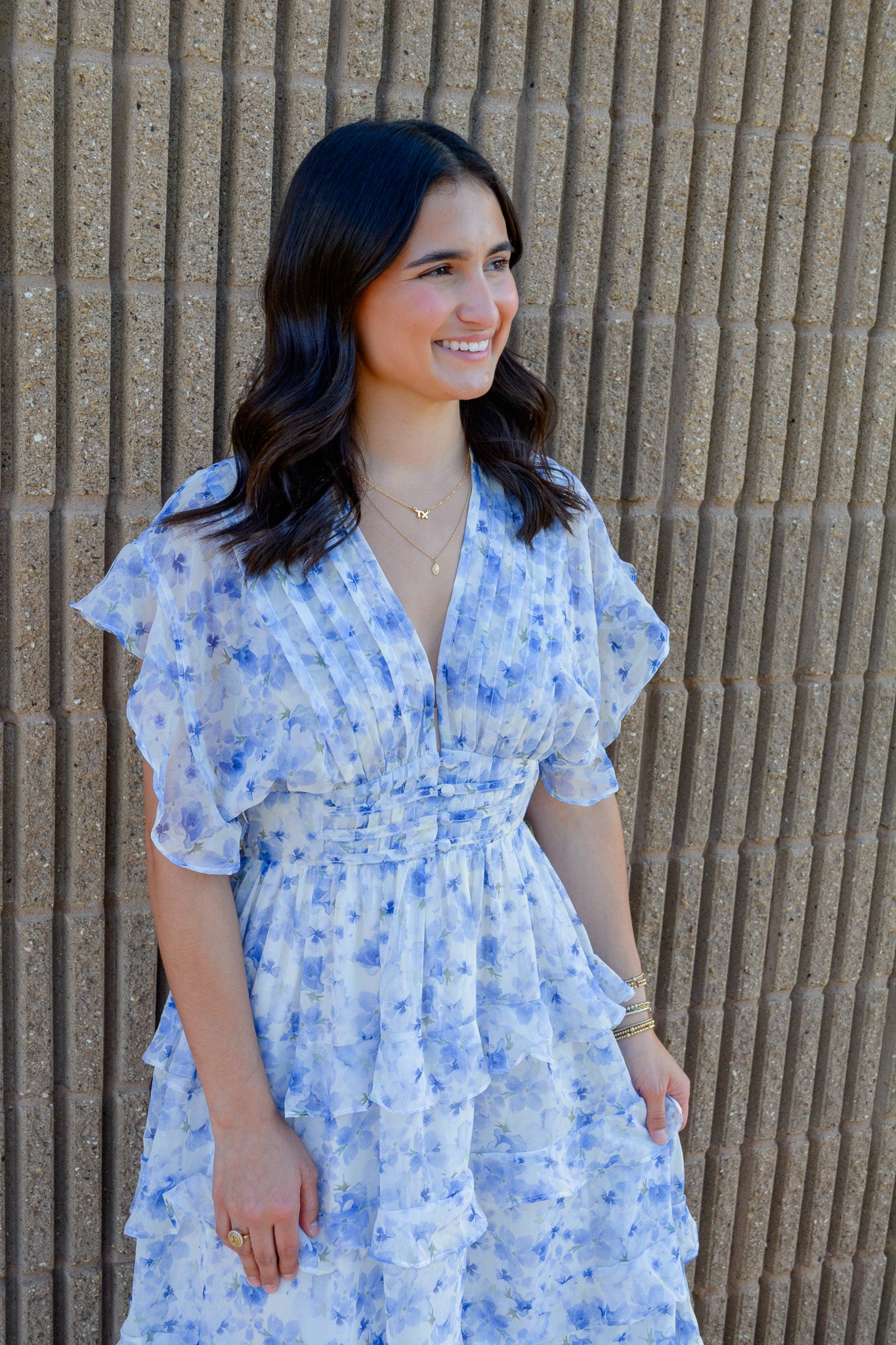 It shows a deep v-neckline, short fluttered, ruffled sleeves, and a cinched empire waist with center buttons. It also has a ruffled, tiered layered, midi bottom and an open back with a crisscross back tie.